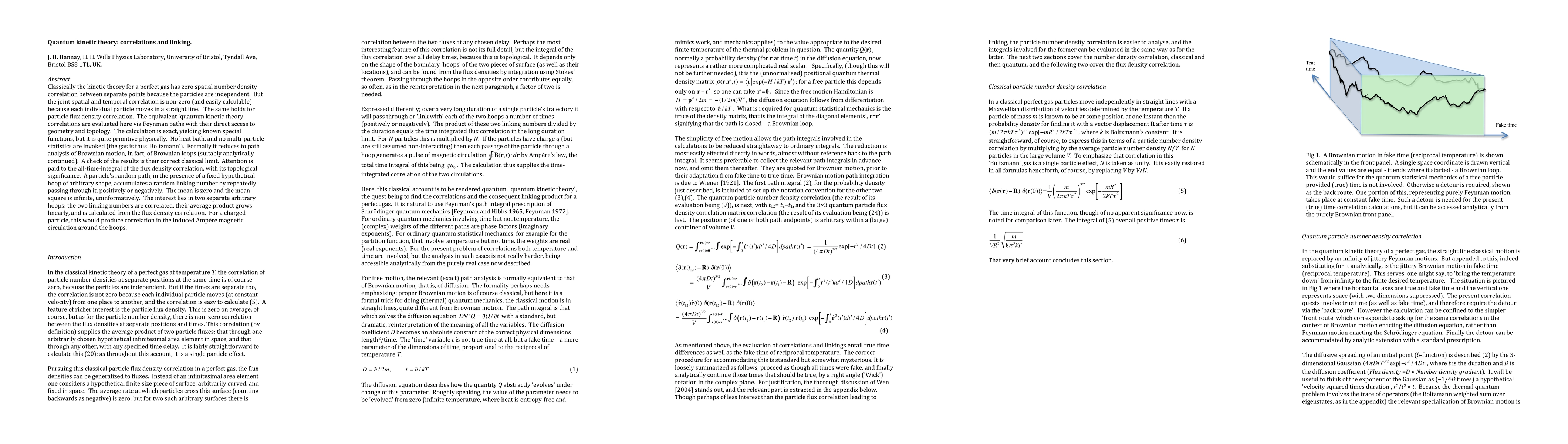 Classically the kinetic theory for a perfect gas has zero spatial number density correlation between separate points because the particles are independent. But the joint spatial and temporal correlation is non-zero (and easily calculable) because each individual particle moves in a straight line. The same holds for particle flux density correlation. The equivalent 'quantum kinetic theory' correlations are evaluated here via Feynman paths with their direct access to geometry and topology. The calculation is exact, yielding known special functions, but it is quite primitive physically. No heat bath, and no multi-particle statistics are invoked (the gas is thus 'Boltzmann'). Formally it reduces to path analysis of Brownian motion, in fact, of Brownian loops (suitably analytically continued). A check of the results is their correct classical limit. Attention is paid to the all-time-integral of the flux density correlation, with its topological significance. A particle's random path, in the presence of a fixed hypothetical hoop of arbitrary shape, accumulates a random linking number by repeatedly passing through it, positively or negatively. The mean is zero and the mean square is infinite, uninformatively. The interest lies in two separate arbitrary hoops: the linking numbers are correlated, their average product grows linearly, and is calculated from the flux density correlation. For a charged particle this would produce a correlation the induced Ampere magnetic circulation around the hoops.