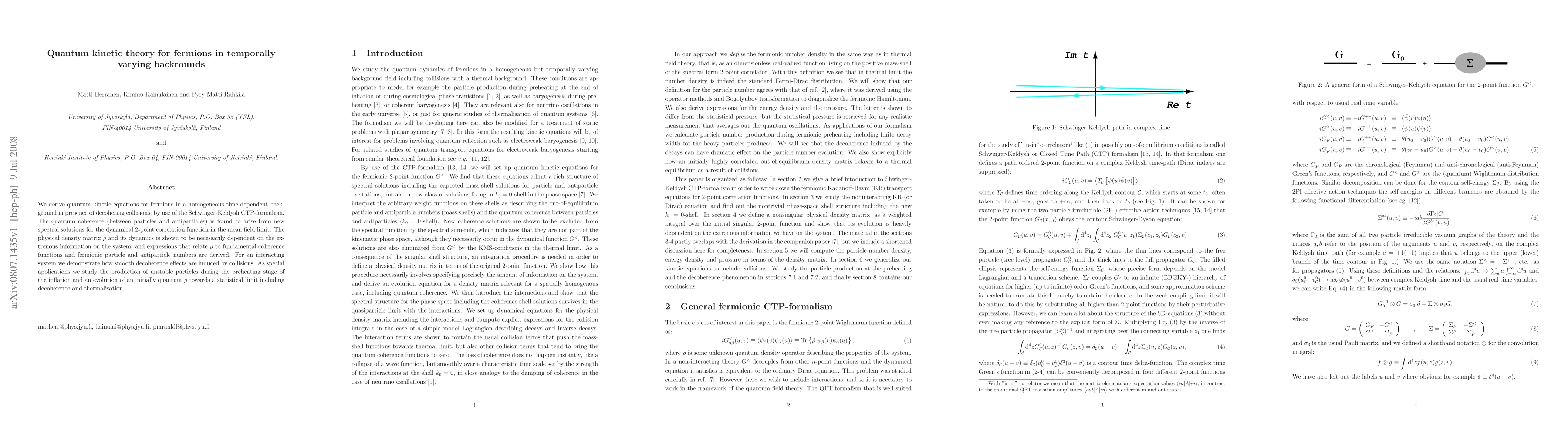 We derive quantum kinetic equations for fermions in a homogeneous time-dependent background in presence of decohering collisions, by use of the Schwinger-Keldysh CTP-formalism. The quantum coherence (between particles and antiparticles) is found to arise from new spectral solutions for the dynamical 2-point correlation function in the mean field limit. The physical density matrix $\rho$ and its dynamics is shown to be necessarily dependent on the extrenous information on the system, and expressions that relate $\rho$ to fundamental coherence functions and fermionic particle and antiparticle numbers are derived. For an interacting system we demonstrate how smooth decoherence effects are induced by collisions. As special applications we study the production of unstable particles during the preheating stage of the inflation and an evolution of an initially quantum $\rho$ towards a statistical limit including decoherence and thermalisation.
