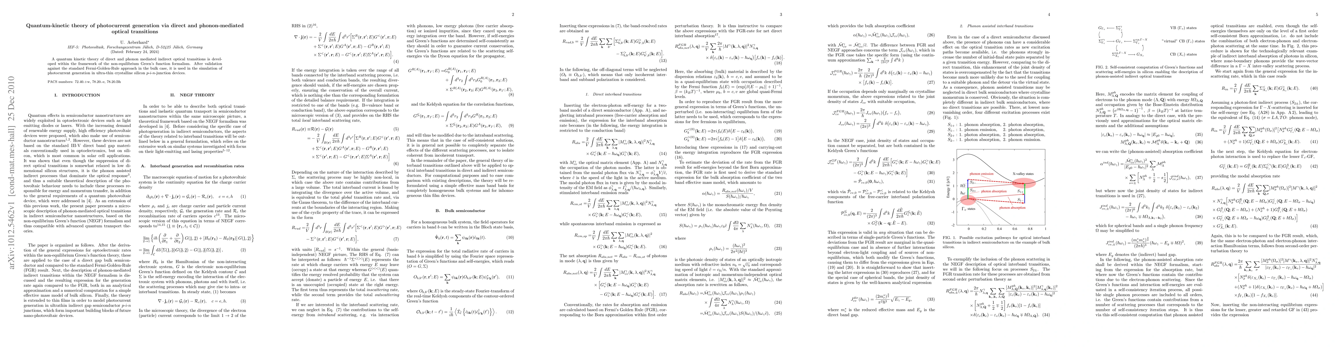 A quantum-kinetic theory of direct and phonon mediated indirect optical transitions is developed within the framework of the non-equilibrium Green's function formalism. After validation against the standard Fermi-Golden-Rule approach in the bulk case, it is used in the simulation of photocurrent generation in ultra-thin crystalline silicon p-i-n-junction devices.