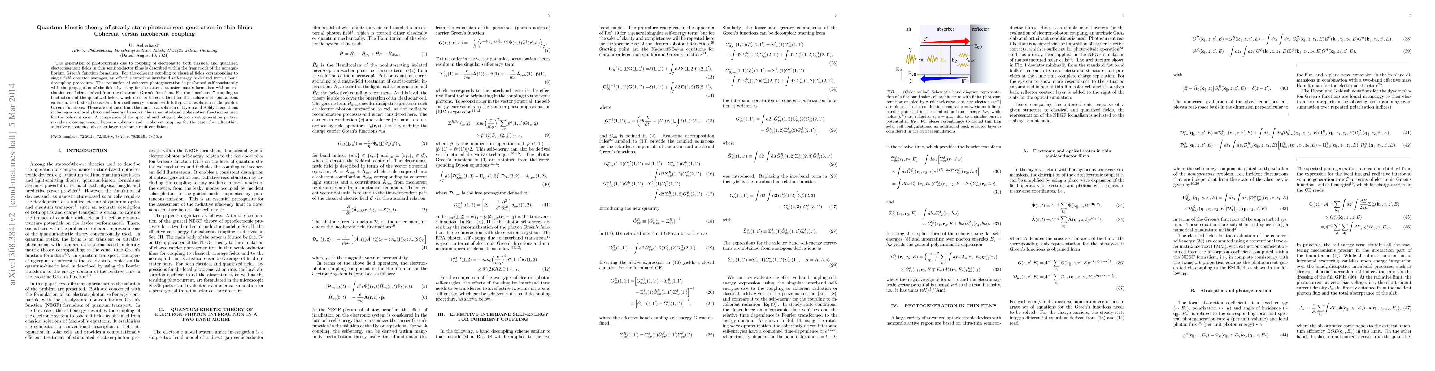 The generation of photocurrents due to coupling of electrons to both classical and quantized electromagnetic fields in thin semiconductor films is described within the framework of the nonequilibrium Green's function formalism. For the coherent coupling to classical fields corresponding to single field operator averages, an effective two-time intraband self-energy is derived from a band decoupling procedure. The evaluation of coherent photogeneration is performed self-consistently with the propagation of the fields by using for the latter a transfer matrix formalism with an extinction coefficient derived from the electronic Green's functions. For the "incoherent" coupling to fluctuations of the quantized fields, which need to be considered for the inclusion of spontaneous emission, the first self-consistent Born self-energy is used, with full spatial resolution in the photon Green's functions. These are obtained from the numerical solution of Dyson and Keldysh equations including a nonlocal photon self-energy based on the same interband polarization function as used for the coherent case. A comparison of the spectral and integral photocurrent generation pattern reveals a close agreement between coherent and incoherent coupling for the case of an ultrathin, selectively contacted absorber layer at short circuit conditions.
