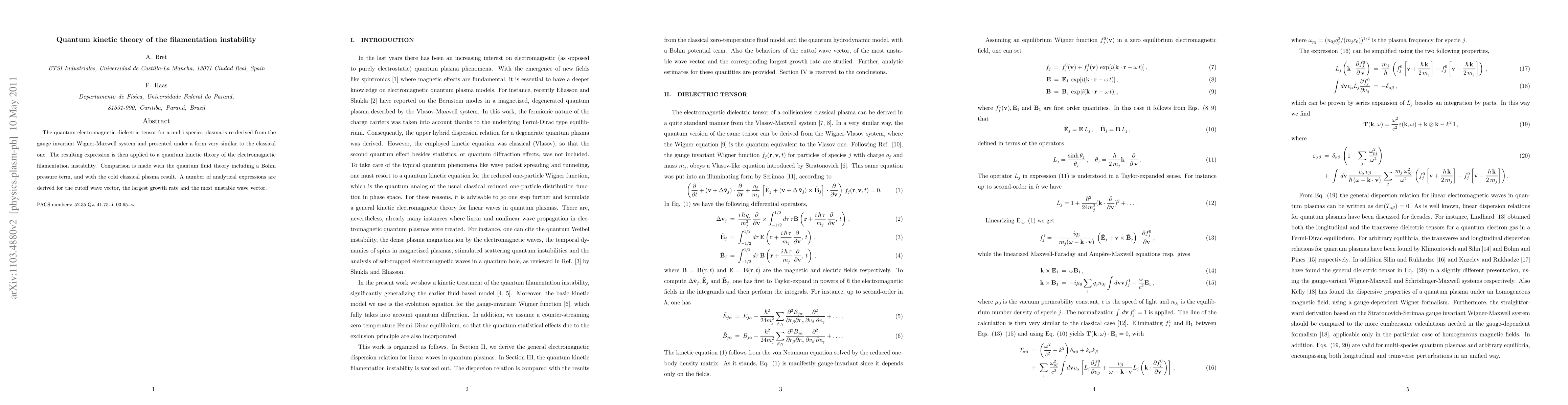 The quantum electromagnetic dielectric tensor for a multi species plasma is re-derived from the gauge invariant Wigner-Maxwell system and presented under a form very similar to the classical one. The resulting expression is then applied to a quantum kinetic theory of the electromagnetic filamentation instability. Comparison is made with the quantum fluid theory including a Bohm pressure term, and with the cold classical plasma result. A number of analytical expressions are derived for the cutoff wave vector, the largest growth rate and the most unstable wave vector.