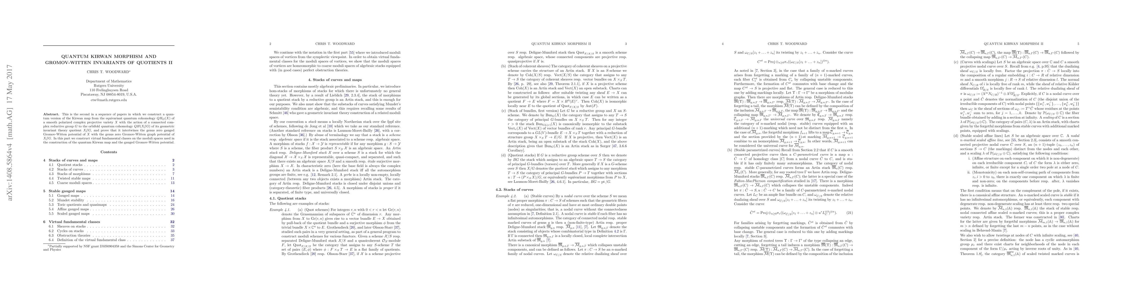This is the second in a sequence of papers in which we construct a quantum version of the Kirwan map from the equivariant quantum cohomology of a smooth polarized complex projective variety with the action of a connected complex reductive group to the orbifold quantum cohomology of its geometric invariant theory quotient, and prove that it intertwines the genus zero gauged Gromov-Witten potential with the genus zero Gromov-Witten graph potential. In this part we construct virtual fundamental classes on the moduli spaces used in the construction of the quantum Kirwan map and the gauged Gromov-Witten potential.