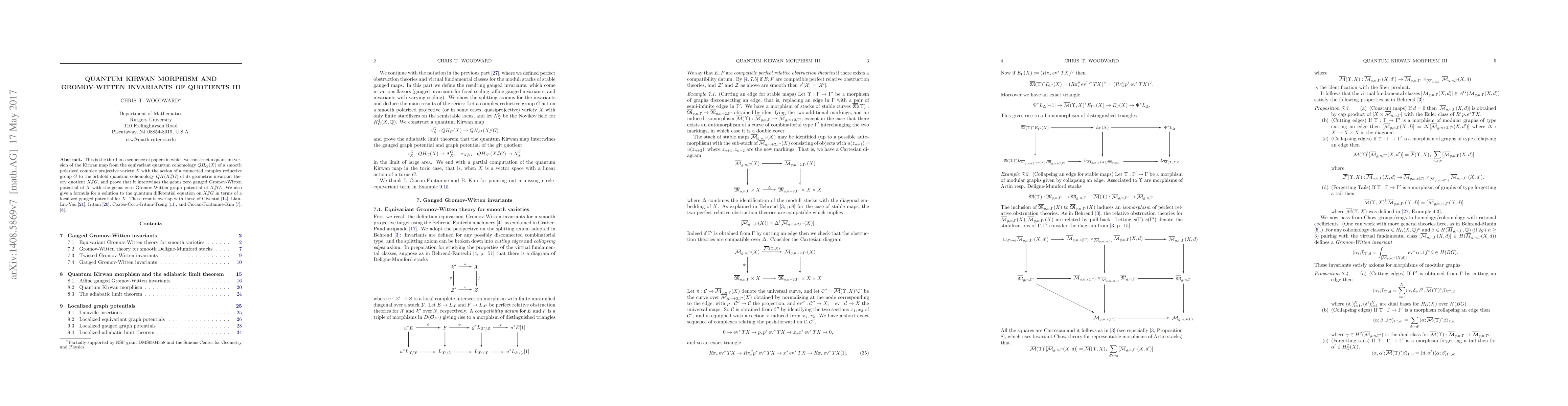 This is the third in a sequence of papers in which we construct a quantum version of the Kirwan map from the equivariant quantum cohomology of a smooth polarized complex projective variety with the action of a connected complex reductive group to the orbifold quantum cohomology of its geometric invariant theory quotient, and prove that it intertwines the genus zero gauged Gromov-Witten potential with the genus zero Gromov-Witten graph potential. We also give a formula for a solution to the quantum differential equation in terms of a localized gauged potential. These results overlap with those of Givental, Lian-Liu-Yau, Coates-Corti-Iritani-Tseng and Ciocan-Fontanine-Kim.
