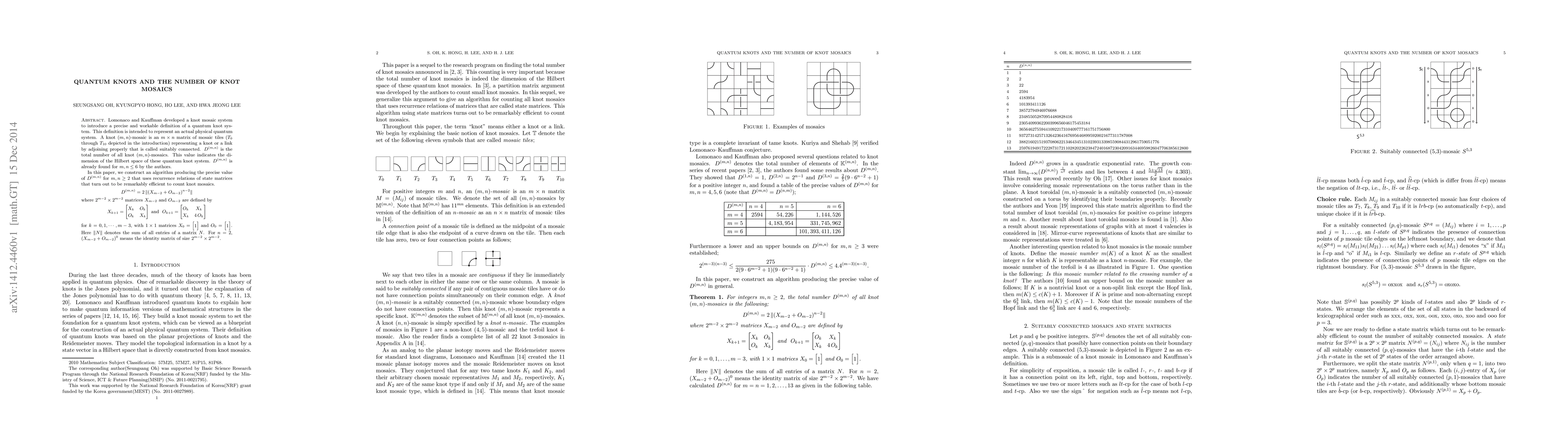 This paper develops an efficient algorithm to compute the number of knot mosaics, $D^{(m,n)}$, using recurrence relations of state matrices. The formula $D^{(m,n)} = 2 \, \| (X_{m-2}+O_{m-2})^{n-2} \|$ leverages matrices $X_{m-2}$ and $O_{m-2}$ to determine the dimension of the Hilbert space for quantum knot systems.