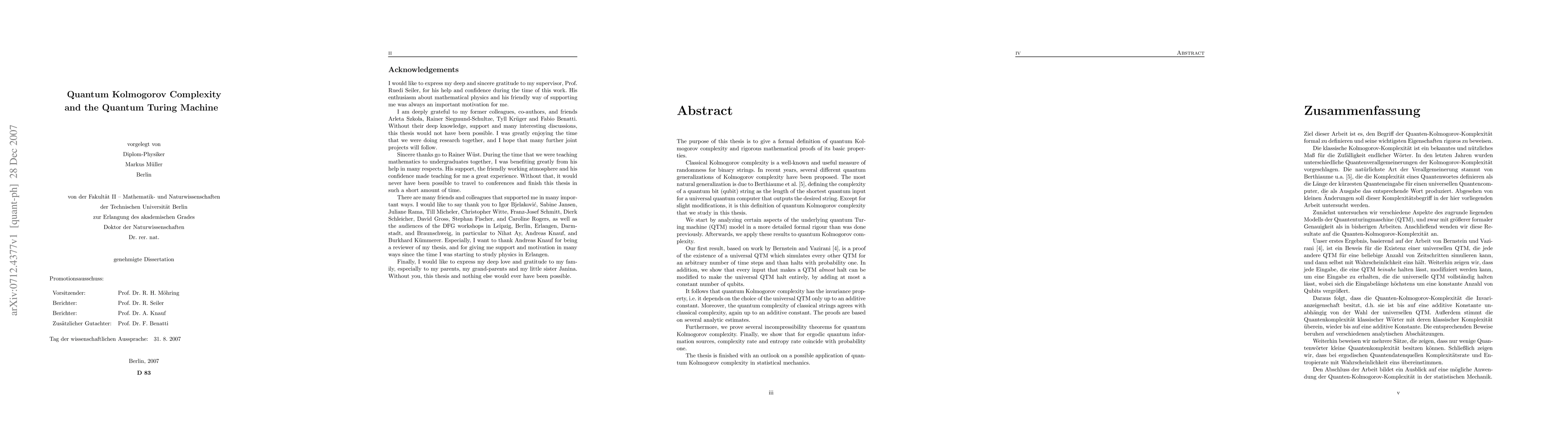 This paper formally defines quantum Kolmogorov complexity (QC) and proves its fundamental properties, showing that QC is invariant, incompressible, and closely relates to classical Kolmogorov complexity and von Neumann entropy. It also establishes a universal quantum Turing machine and discusses transformations of almost-halting inputs.