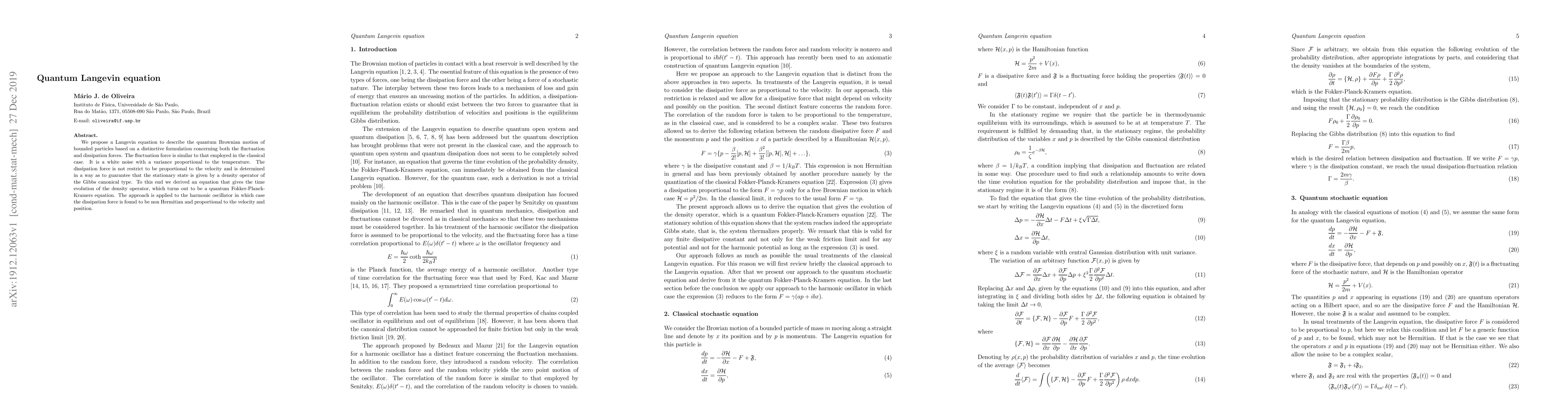 The paper proposes a quantum Langevin equation to describe quantum Brownian motion, incorporating both fluctuation and dissipation forces. The derived quantum Fokker-Planck-Kramers equation ensures the stationary state follows the Gibbs canonical density operator, and is applied to the harmonic oscillator, revealing a non-Hermitian dissipation force.