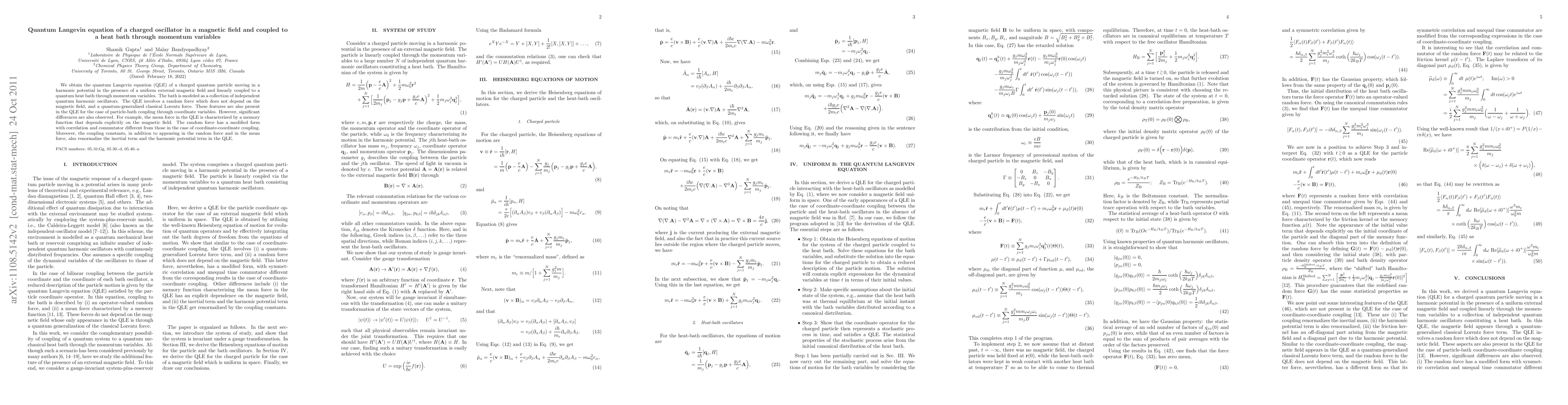 This paper derives the quantum Langevin equation for a charged quantum particle in a harmonic potential under a magnetic field, coupled to a quantum heat bath via momentum variables. The equation features a unique random force and mean force influenced by the magnetic field, differing from coupling through coordinate variables, and includes renormalization effects on inertial and potential terms.