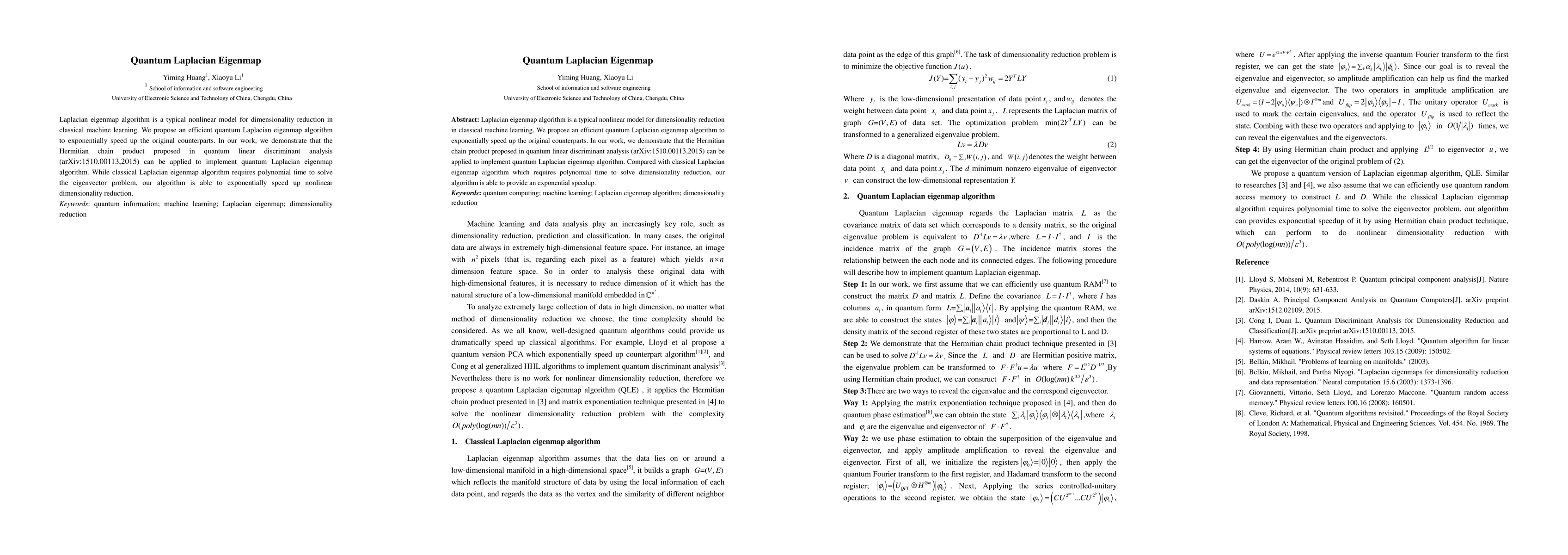 This paper proposes a quantum Laplacian eigenmap algorithm to significantly speed up the classical nonlinear dimensionality reduction process. The authors utilize the Hermitian chain product from quantum linear discriminant analysis to achieve exponential acceleration over the polynomial time required by classical methods.