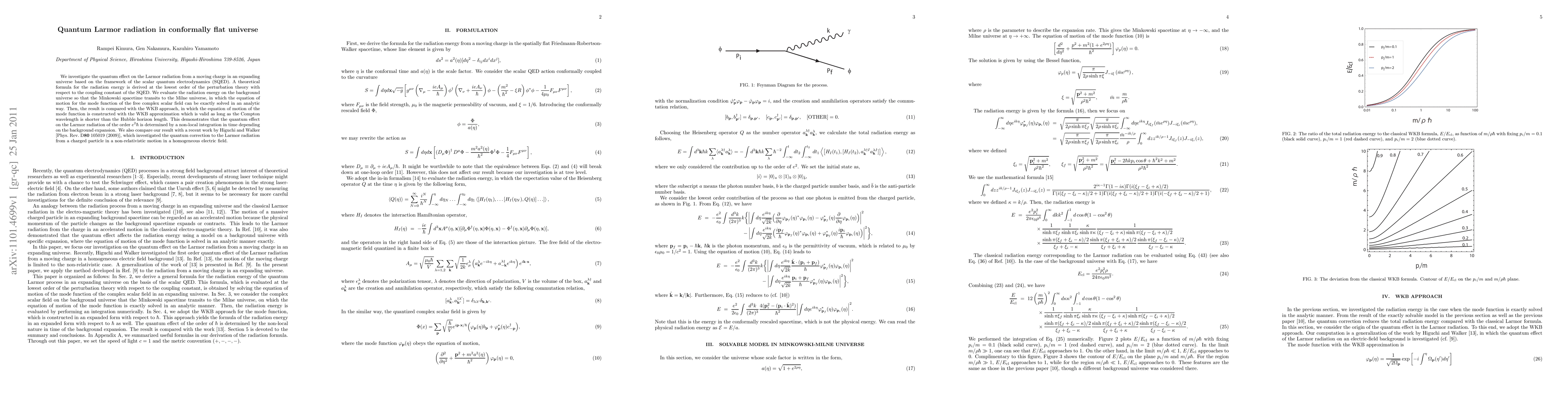 This paper derives a theoretical formula for the quantum effect on Larmor radiation in an expanding universe using scalar quantum electrodynamics, and compares it with the WKB approach and previous work by Higuchi and Walker, showing that the radiation energy depends on the background expansion.