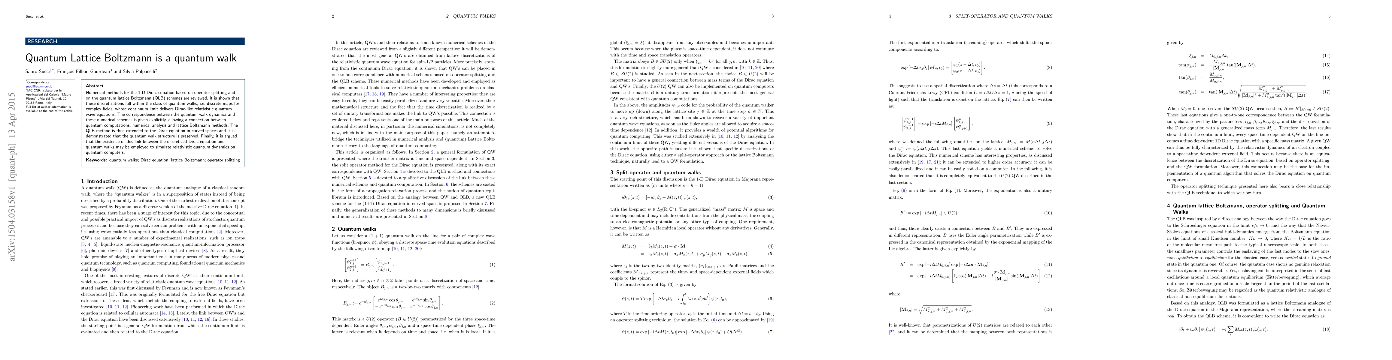 This paper reviews quantum lattice Boltzmann (QLB) schemes for the 1-D Dirac equation, demonstrating their equivalence to quantum walks, which can simulate relativistic quantum dynamics. The QLB method is extended to curved spaces, maintaining the quantum walk structure, suggesting its potential for quantum computer simulations.