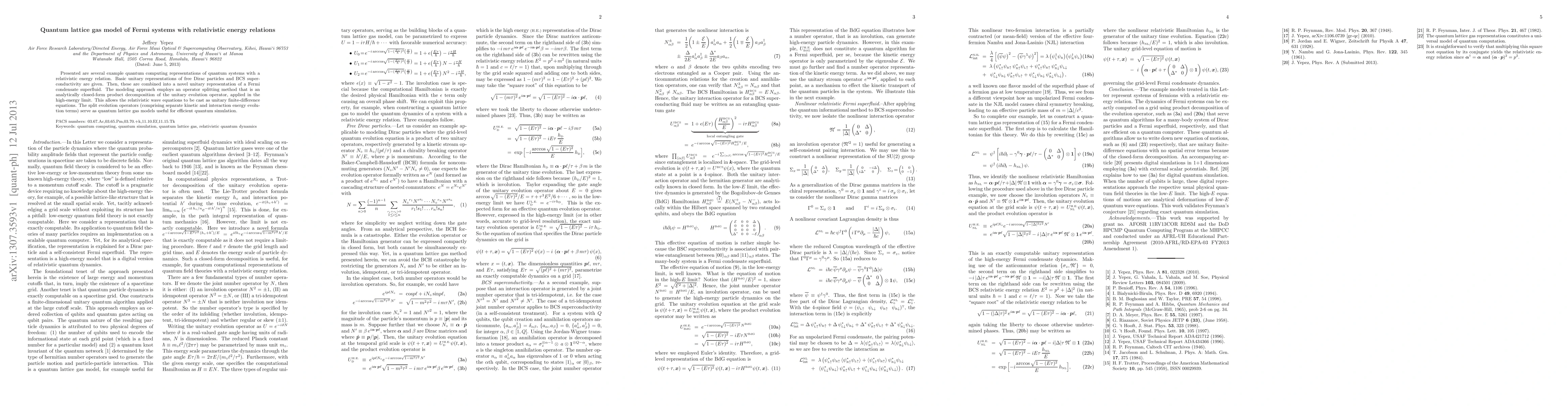 Presented are several example quantum computing representations of quantum systems with a relativistic energy relation. Basic unitary representations of free Dirac particles and BCS superconductivity are given. Then, these are combined into a novel unitary representation of a Fermi condensate superfluid. The modeling approach employs an operator splitting method that is an analytically closed-form product decomposition of the unitary evolution operator, applied in the high-energy limit. This allows the relativistic wave equations to be cast as unitary finite-difference equations. The split evolution operators (comprising separate kinetic and interaction energy evolution terms) serve as quantum lattice gas models useful for efficient quantum simulation.