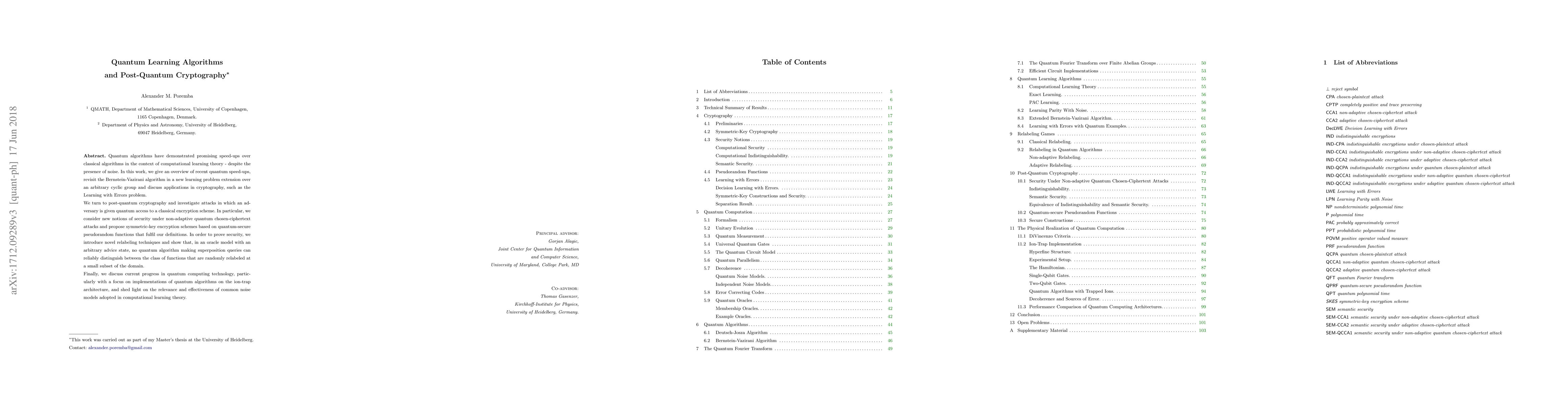 Quantum algorithms have demonstrated promising speed-ups over classical algorithms in the context of computational learning theory - despite the presence of noise. In this work, we give an overview of recent quantum speed-ups, revisit the Bernstein-Vazirani algorithm in a new learning problem extension over an arbitrary cyclic group and discuss applications in cryptography, such as the Learning with Errors problem. We turn to post-quantum cryptography and investigate attacks in which an adversary is given quantum access to a classical encryption scheme. In particular, we consider new notions of security under non-adaptive quantum chosen-ciphertext attacks and propose symmetric-key encryption schemes based on quantum-secure pseudorandom functions that fulfil our definitions. In order to prove security, we introduce novel relabeling techniques and show that, in an oracle model with an arbitrary advice state, no quantum algorithm making superposition queries can reliably distinguish between the class of functions that are randomly relabeled at a small subset of the domain. Finally, we discuss current progress in quantum computing technology, particularly with a focus on implementations of quantum algorithms on the ion-trap architecture, and shed light on the relevance and effectiveness of common noise models adopted in computational learning theory.