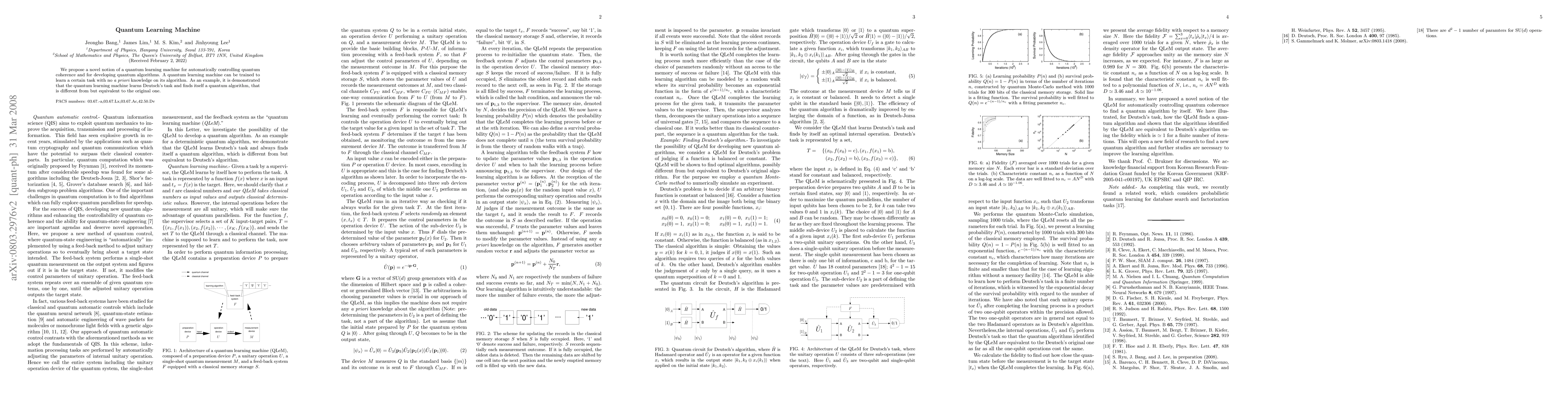 The paper proposes a Quantum Learning Machine (QLeM) that uses a feedback system with classical memory to iteratively adjust control parameters of a unitary operation device to learn a task without prior algorithm knowledge. The QLeM's learning algorithm updates parameters based on success/failure records in the memory, demonstrated through a quantum Monte Carlo simulation.