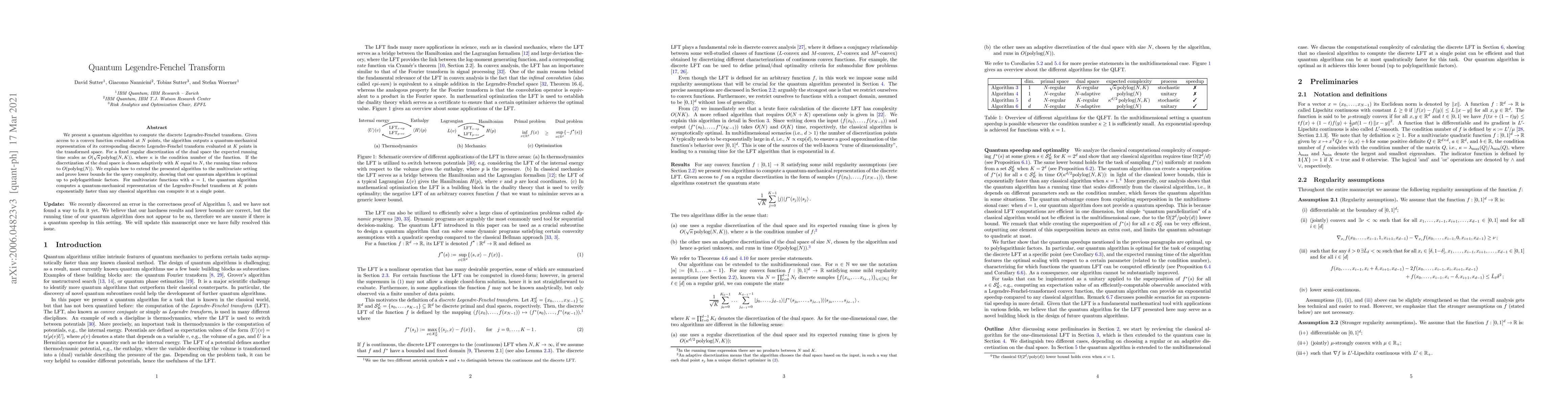 This paper introduces a quantum algorithm for computing the discrete Legendre-Fenchel transform of convex functions, achieving optimal query complexity up to polylogarithmic factors. The algorithm runs in $O(\sqrt{\kappa}\,\mathrm{polylog}(N,K))$ time for fixed discretization, and $O(\mathrm{polylog}(N))$ when adaptively choosing $K=N$.