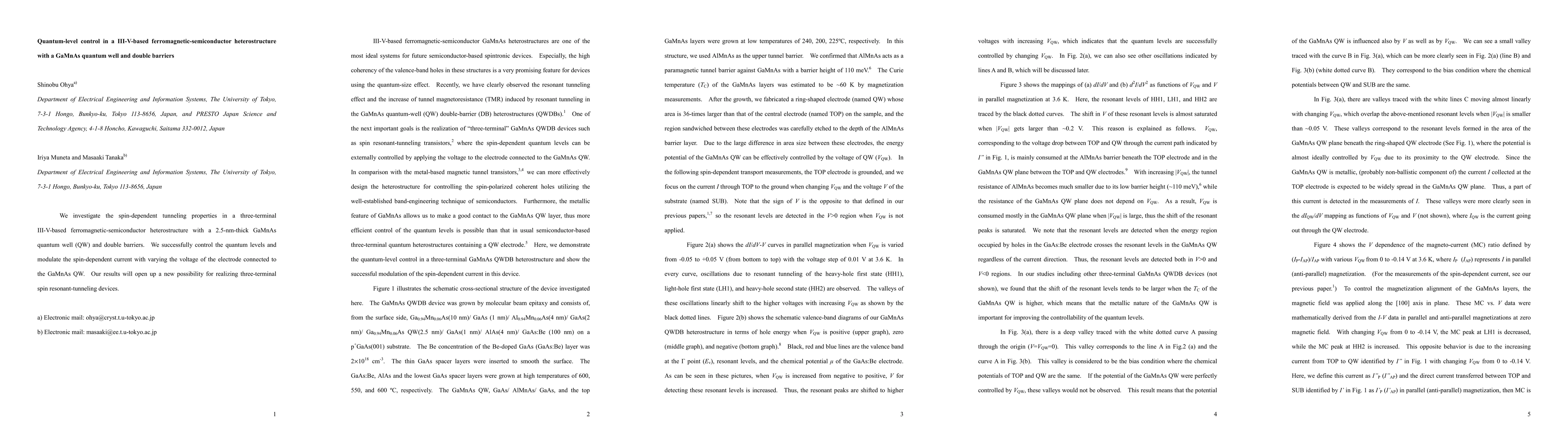 This paper explores spin-dependent tunneling in a III-V ferromagnetic-semiconductor heterostructure featuring a GaMnAs quantum well and double barriers, demonstrating control over quantum levels and modulation of spin-dependent current via electrode voltage. The findings suggest potential for developing three-terminal spin resonant-tunneling devices.