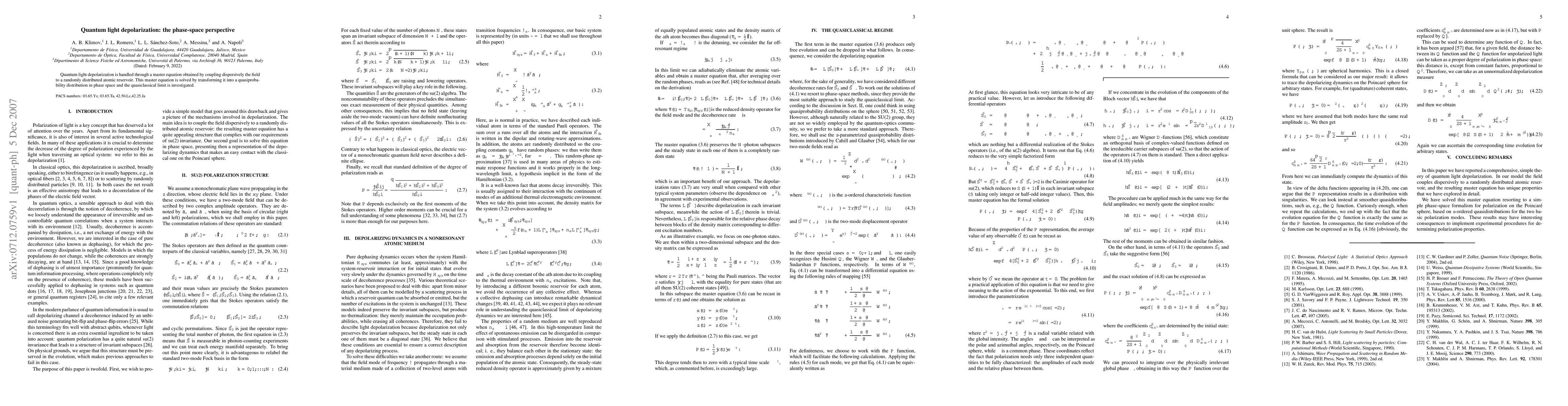 This paper investigates quantum light depolarization using a master equation that couples the field to an atomic reservoir, solving it via a phase-space quasiprobability distribution and exploring its quasiclassical limit. The study provides insights into the depolarization process from a phase-space perspective.