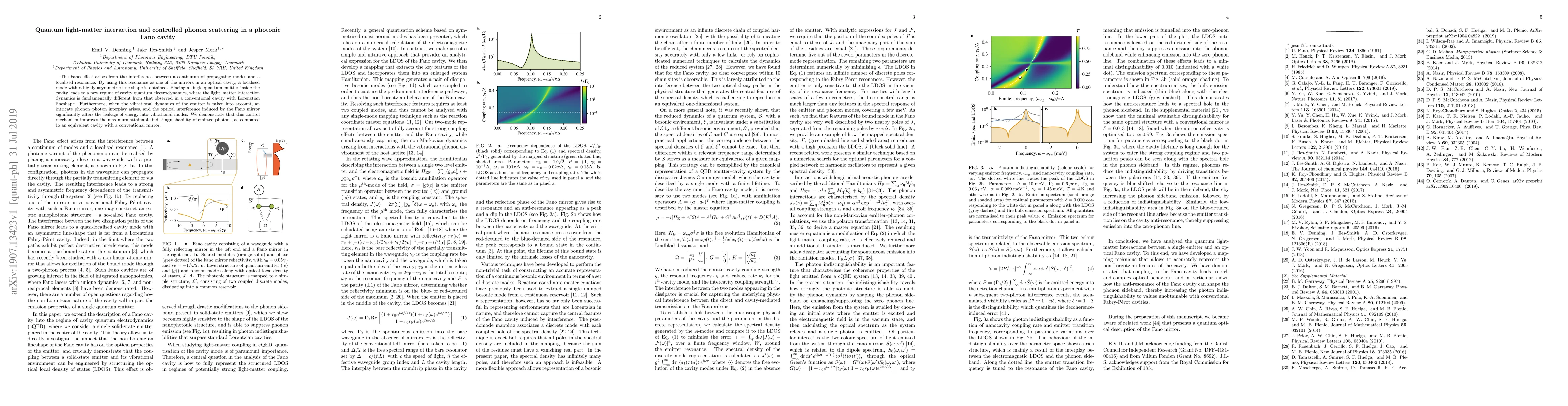 The Fano effect arises from the interference between a continuum of propagating modes and a localised resonance. By using this resonance as one of the mirrors in an optical cavity, a localised mode with a highly asymmetric line shape is obtained. Placing a single quantum emitter inside the cavity leads to a new regime of cavity quantum electrodynamics, where the light-matter interaction dynamics is fundamentally different from that observed in a conventional cavity with Lorenztian lineshape. Furthermore, when the vibrational dynamics of the emitter is taken into account, an intricate phonon-photon interplay arises, and the optical interference induced by the Fano mirror significantly alters the leakage of energy into vibrational modes. We demonstrate that this control mechanism improves the maximum attainable indistinguishability of emitted photons, as compared to an equivalent cavity with a conventional mirror.