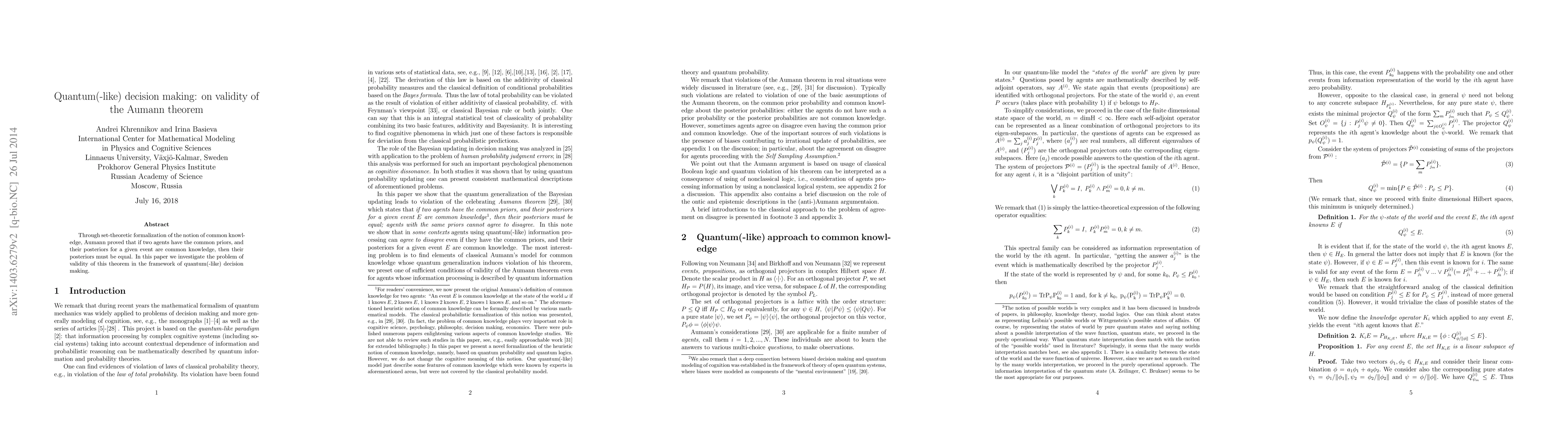 This paper investigates the validity of Aumann's theorem in quantum-like decision making, finding that equal posteriors cannot be guaranteed even with common priors and knowledge.