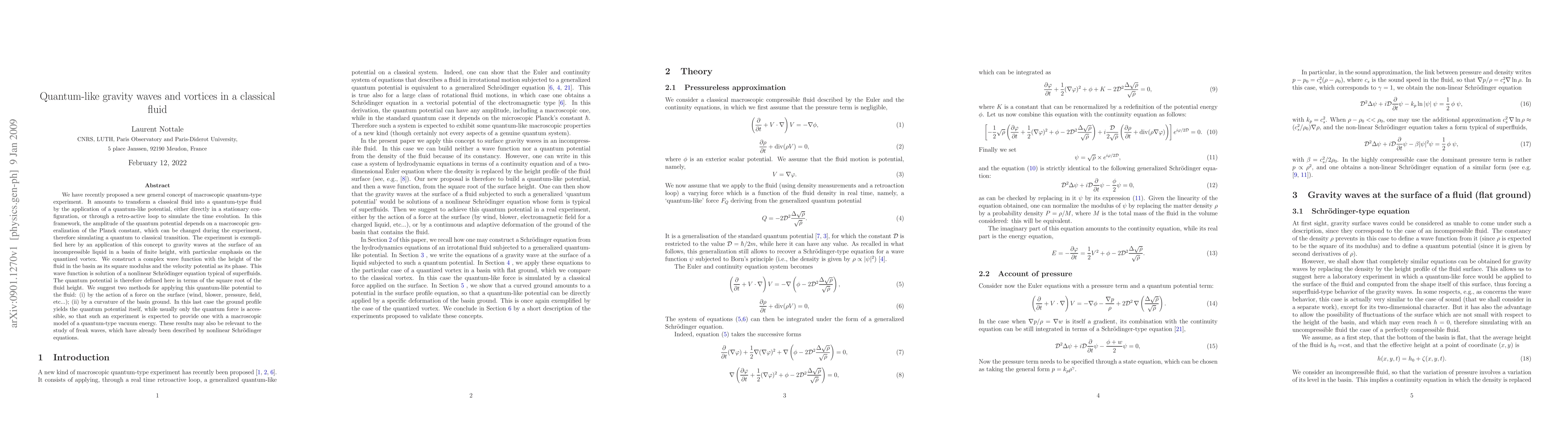 We have recently proposed a new general concept of macroscopic quantum-type experiment. It amounts to transform a classical fluid into a quantum-type fluid by the application of a quantum-like potential, either directly in a stationary configuration, or through a retro-active loop to simulate the time evolution. In this framework, the amplitude of the quantum potential depends on a macroscopic generalization of the Planck constant, which can be changed during the experiment, therefore simulating a quantum to classical transition. The experiment is exemplified here by an application of this concept to gravity waves at the surface of an incompressible liquid in a basin of finite height, with particular emphasis on the quantized vortex. We construct a complex wave function with the height of the fluid in the basin as its square modulus and the velocity potential as its phase. This wave function is solution of a nonlinear Schrodinger equation typical of superfluids. The quantum potential is therefore defined here in terms of the square root of the fluid height. We suggest two methods for applying this quantum-like potential to the fluid: (i) by the action of a force on the surface (wind, blower, pressure, field, etc...); (ii) by a curvature of the basin ground. In this last case the ground profile yields the quantum potential itself, while usually only the quantum force is accessible, so that such an experiment is expected to provide one with a macroscopic model of a quantum-type vacuum energy. These results may also be relevant to the study of freak waves, which have already been described by nonlinear Schrodinger equations.