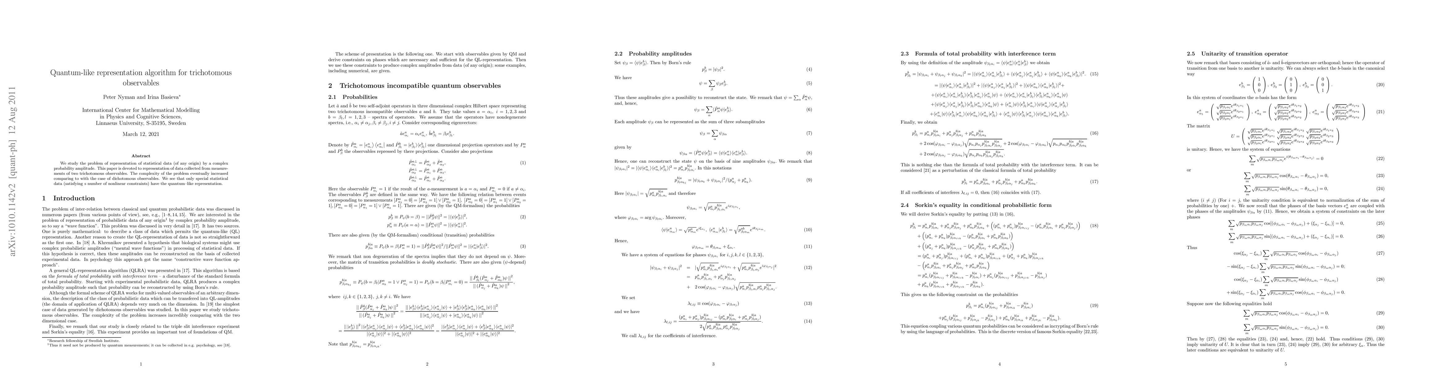 We study the problem of representation of statistical data (of any origin) by a complex probability amplitude. This paper is devoted to representation of data collected from measurements of two trichotomous observables. The complexity of the problem eventually increased comparing to with the case of dichotomous observables. We see that only special statistical data (satisfying s number of nonlinear constraints) have the quantum--like representation.