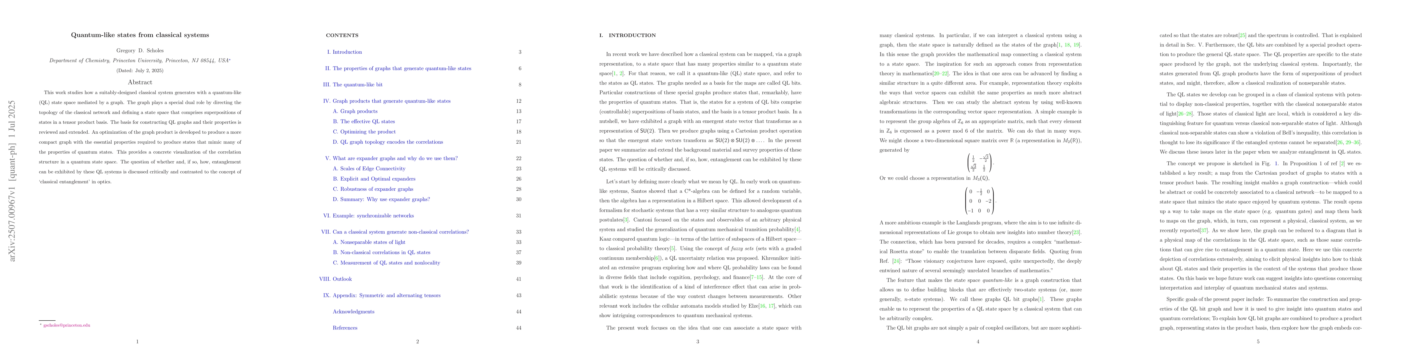 This work studies how a suitably-designed classical system generates with a quantum-like (QL) state space mediated by a graph. The graph plays a special dual role by directing the topology of the classical network and defining a state space that comprises superpositions of states in a tensor product basis. The basis for constructing QL graphs and their properties is reviewed and extended. An optimization of the graph product is developed to produce a more compact graph with the essential properties required to produce states that mimic many of the properties of quantum states. This provides a concrete visualization of the correlation structure in a quantum state space. The question of whether and, if so, how, entanglement can be exhibited by these QL systems is discussed critically and contrasted to the concept of `classical entanglement' in optics.