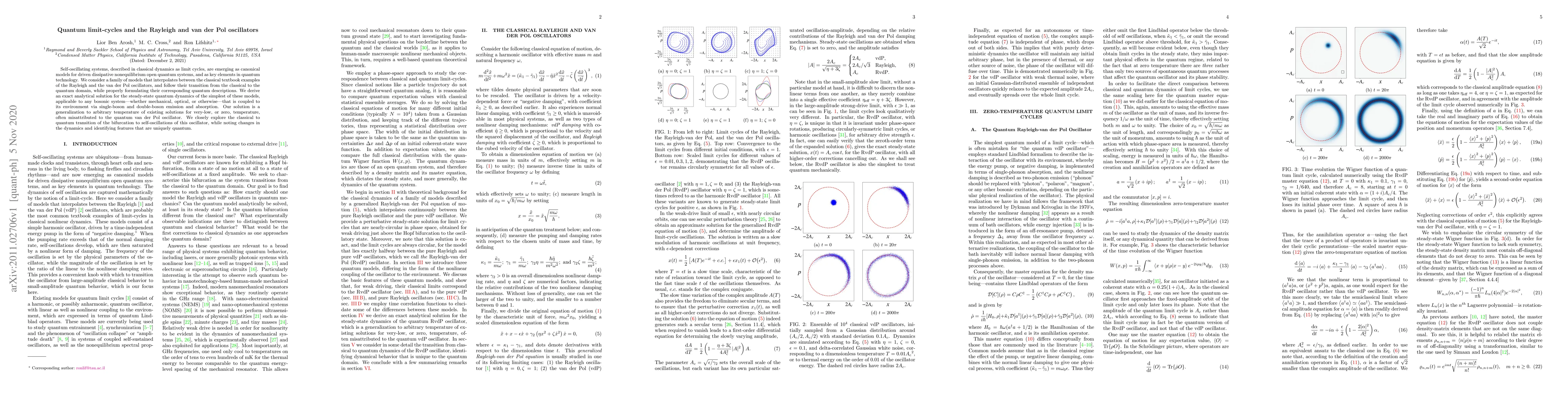 Self-oscillating systems, described in classical dynamics as limit cycles, are emerging as canonical models for driven dissipative nonequilibrium open quantum systems, and as key elements in quantum technology. We consider a family of models that interpolates between the classical textbook examples of the Rayleigh and the van der Pol oscillators, and follow their transition from the classical to the quantum domain, while properly formulating their corresponding quantum descriptions. We derive an exact analytical solution for the steady-state quantum dynamics of the simplest of these models, applicable to any bosonic system---whether mechanical, optical, or otherwise---that is coupled to its environment via single-boson and double-boson emission and absorption. Our solution is a generalization to arbitrary temperature of existing solutions for very-low, or zero, temperature, often misattributed to the quantum van der Pol oscillator. We closely explore the classical to quantum transition of the bifurcation to self-oscillations of this oscillator, while noting changes in the dynamics and identifying features that are uniquely quantum.