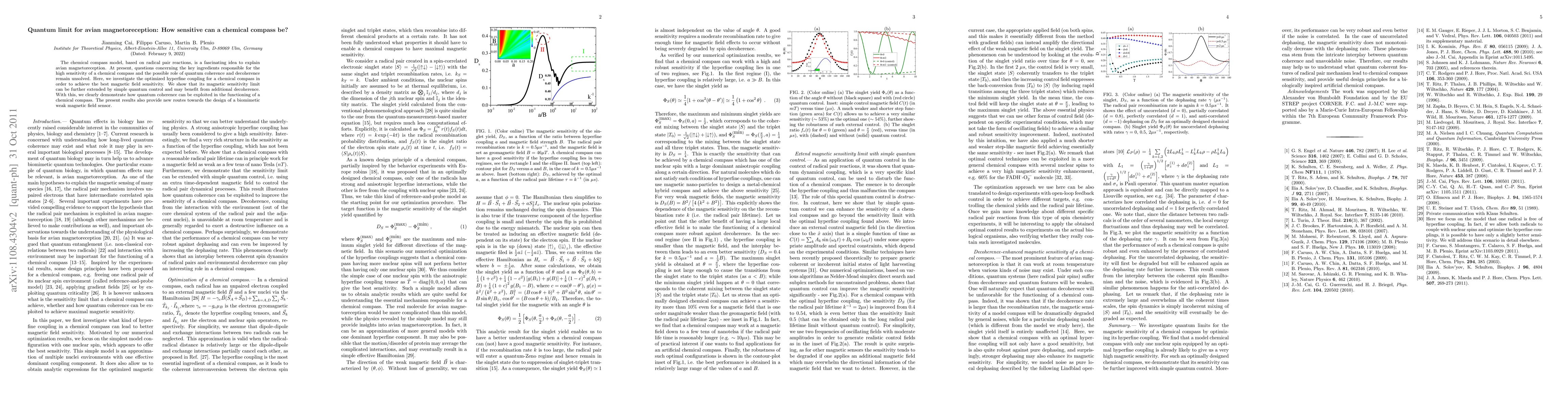 This paper explores the quantum limits of avian magnetoreception through the chemical compass model, revealing that optimized hyperfine coupling can enhance magnetic field sensitivity. The study demonstrates that quantum control and decoherence can further extend the sensitivity of the chemical compass, offering insights into the design of biomimetic magnetic field sensors.