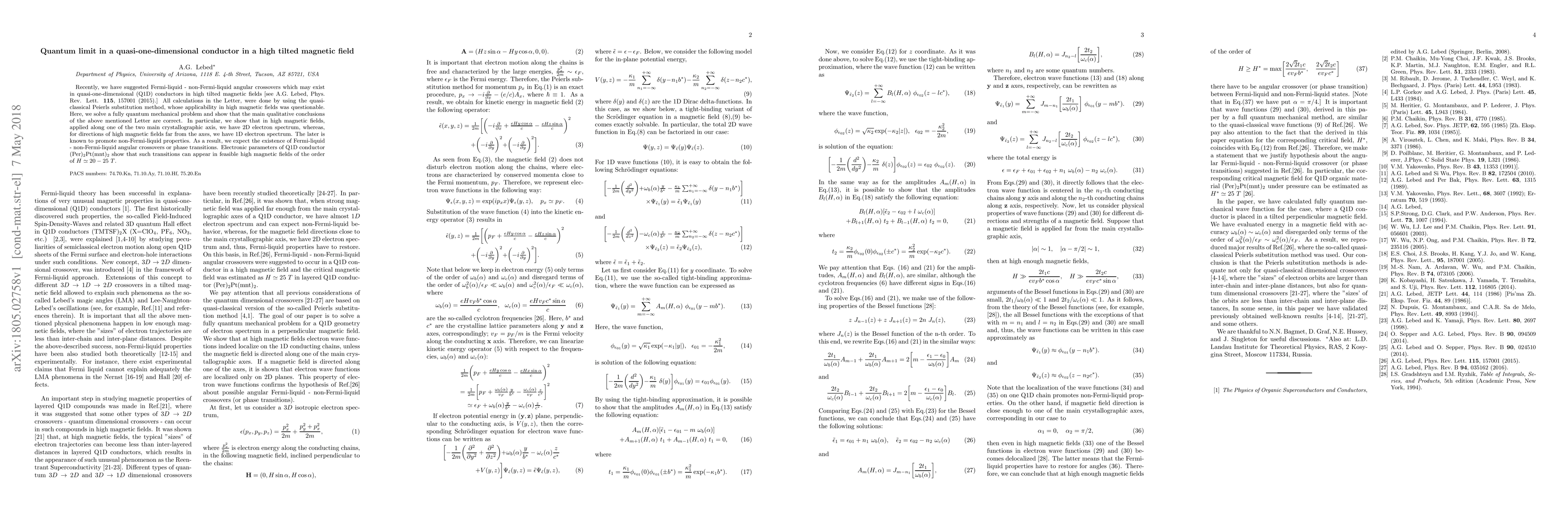 Recently, we have suggested Fermi-liquid - non-Fermi-liquid angular crossovers which may exist in quasi-one-dimensional (Q1D)conductors in high tilted magnetic fields [see A.G. Lebed, Phys. Rev. Lett. $\textbf{115}$, 157001 (2015).] All calculations in the Letter, were done by using the quasi-classical Peierls substitution method, whose applicability in high magnetic fields was questionable. Here, we solve a fully quantum mechanical problem and show that the main qualitative conclusions of the above mentioned Letter are correct. In particular, we show that in high magnetic fields, applied along one of the two main crystallographic axis, we have 2D electron spectrum, whereas, for directions of high magnetic fields far from the axes, we have 1D electron spectrum. The later is known to promote non-Fermi-liquid properties. As a result, we expect the existence of Fermi-liquid - non-Fermi-liquid angular crossovers or phase transitions. Electronic parameters of Q1D conductor (Per)$_2$Pt(mnt)$_2$ show that such transitions can appear in feasible high magnetic fields of the order of $H \simeq 20-25 \ T$.
