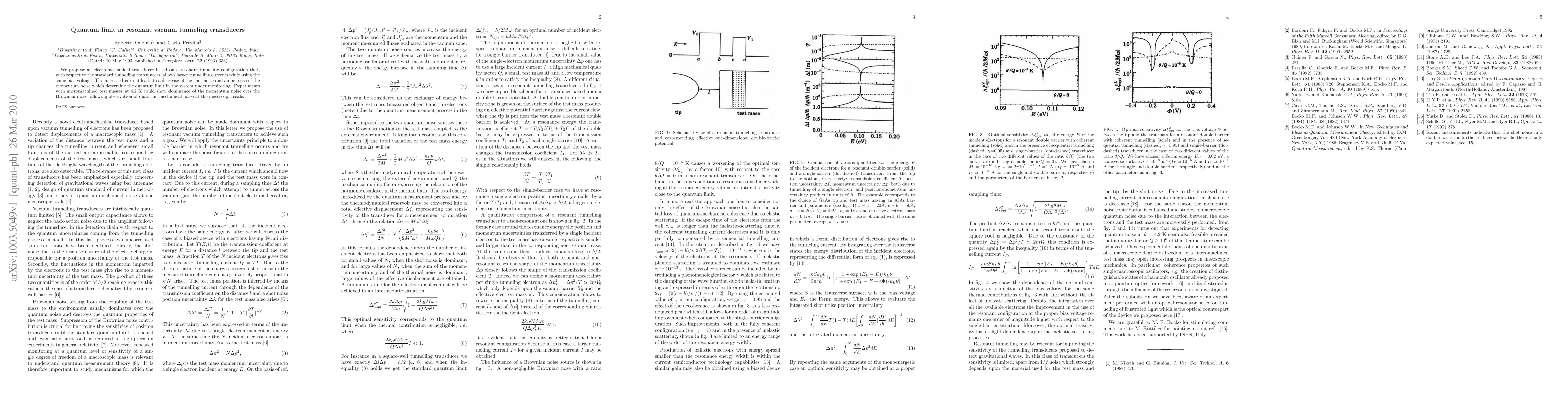 This paper proposes a resonant vacuum tunneling transducer that achieves larger tunneling currents than standard models, leading to increased shot and momentum noise. Experiments at 4.2 K demonstrate that momentum noise dominates over Brownian noise, revealing quantum-mechanical noise at the mesoscopic scale.