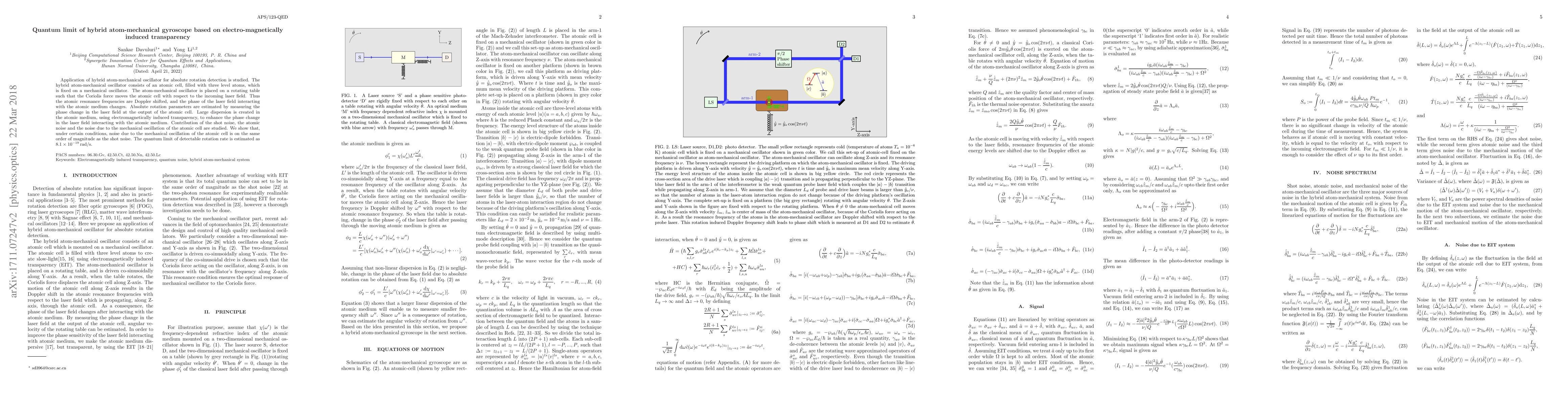 Application of hybrid atom-mechanical oscillator for absolute rotation detection is studied. The hybrid atom-mechanical oscillator consists of an atomic cell, filled with three level atoms, which is fixed on a mechanical oscillator. The atom-mechanical oscillator is placed on a rotating table such that the Coriolis force moves the atomic cell with respect to the incoming laser field. Thus the atomic resonance frequencies are Doppler shifted, and the phase of the laser field interacting with the atomic medium changes. Absolute rotation parameters are estimated by measuring the phase change in the laser field at the output of the atomic cell. Large dispersion is created in the atomic medium, using electromagnetically induced transparency, to enhance the phase change in the laser field interacting with the atomic medium. Contribution of the shot noise, the atomic noise and the noise due to the mechanical oscillation of the atomic cell are studied. We show that, under certain conditions, noise due to the mechanical oscillation of the atomic cell is on the same order of magnitude as the shot noise. The quantum limit of detectable rotation rate is estimated as $8.1\times10^{-19}$\,rad/s.
