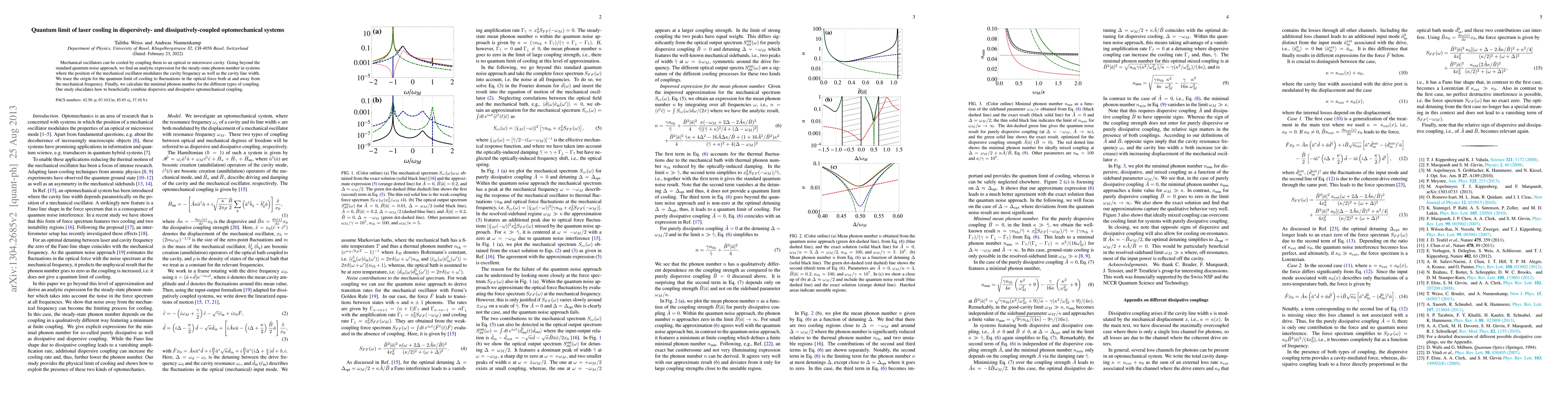 This paper derives an analytic expression for the steady-state phonon number in optomechanical systems where mechanical oscillators modulate both cavity frequency and line width, revealing the quantum limit of laser cooling. It identifies the minimal phonon number for different coupling types, highlighting the benefits of combining dispersive and dissipative coupling.