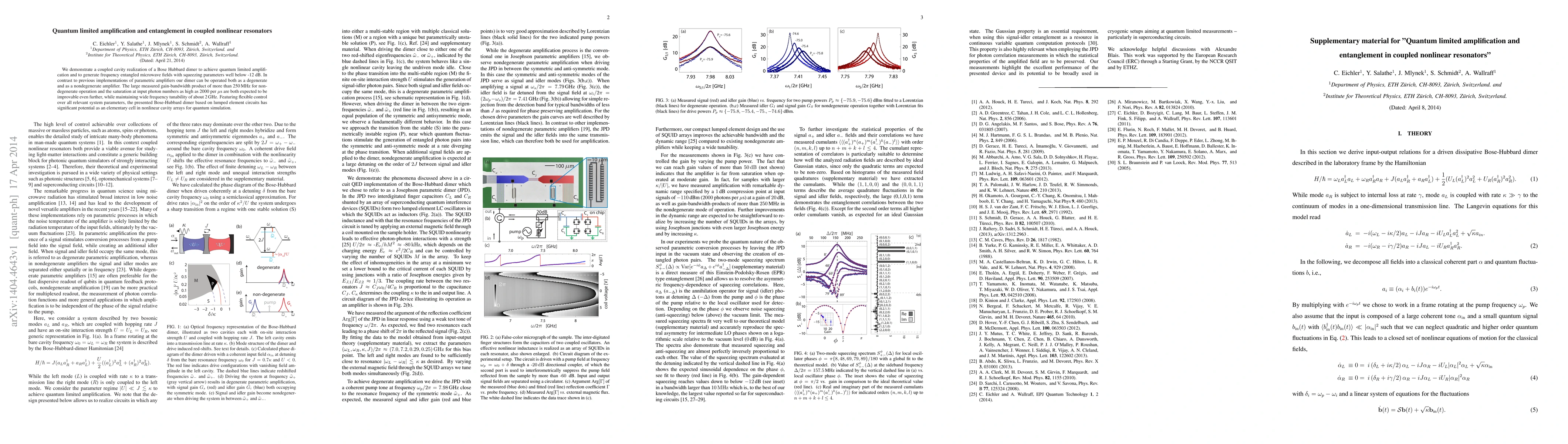 This paper demonstrates a Bose Hubbard dimer in coupled cavity resonators achieving quantum limited amplification and generating frequency entangled microwave fields with squeezing below -12 dB. The dimer operates as both degenerate and nondegenerate amplifiers, showing a large gain-bandwidth product and high input photon saturation, promising further improvements and wide frequency tunability.