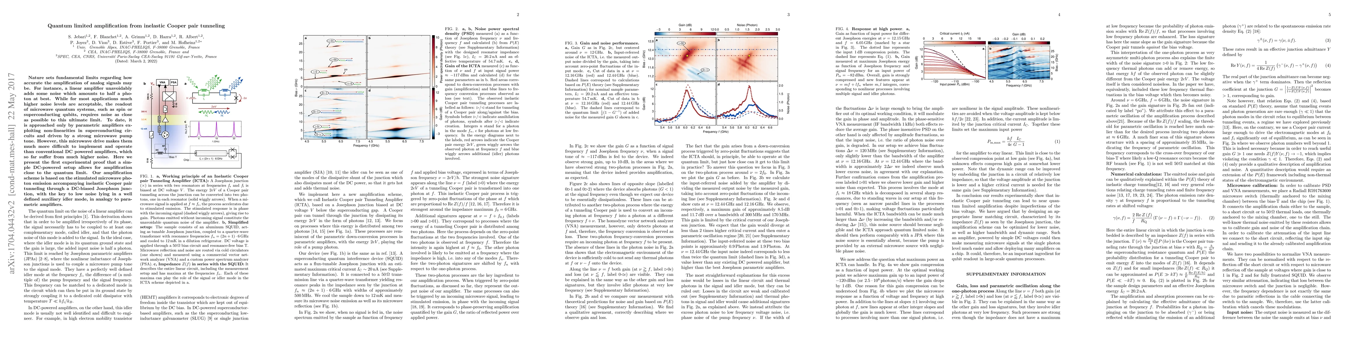 This paper demonstrates a DC-powered amplification method achieving quantum-limited performance by utilizing inelastic Cooper pair tunneling through a Josephson junction, which leverages a well-defined auxiliary idler mode to minimize noise, rivaling the performance of complex microwave-driven parametric amplifiers.