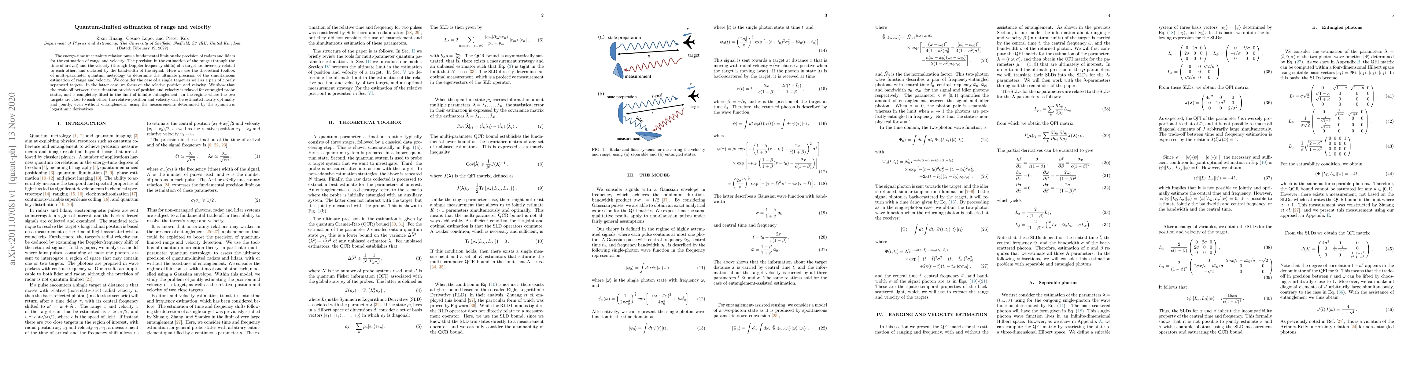The energy-time uncertainty relation puts a fundamental limit on the precision of radars and lidars for the estimation of range and velocity. The precision in the estimation of the range (through the time of arrival) and the velocity (through Doppler frequency shifts) of a target are inversely related to each other, and dictated by the bandwidth of the signal. Here we use the theoretical toolbox of multi-parameter quantum metrology to determine the ultimate precision of the simultaneous estimation of range and velocity. We consider the case of a single target as well as a pair of closely separated targets. In the latter case, we focus on the relative position and velocity. We show that the trade-off between the estimation precision of position and velocity is relaxed for entangled probe states, and is completely lifted in the limit of infinite entanglement. In the regime where the two targets are close to each other, the relative position and velocity can be estimated nearly optimally and jointly, even without entanglement, using the measurements determined by the symmetric logarithmic derivatives.