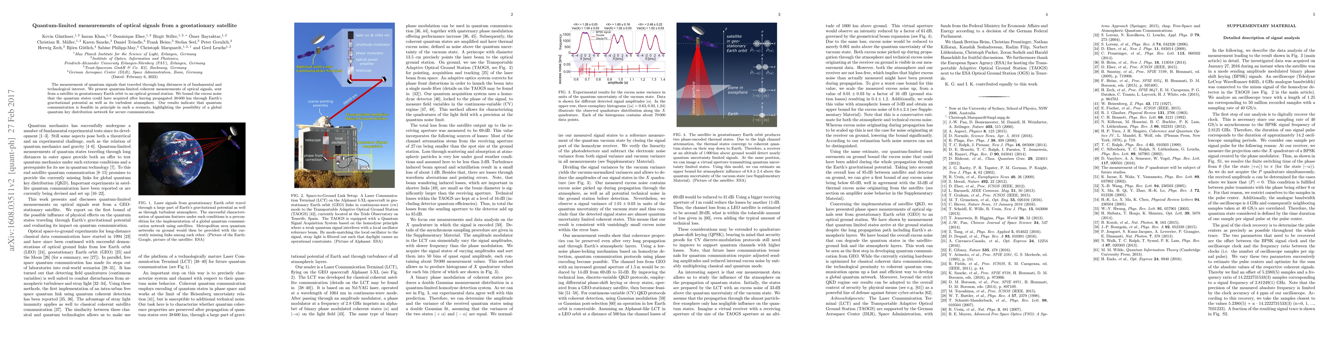 This paper demonstrates quantum-limited coherent measurements of optical signals transmitted from a geostationary satellite to a ground station, showing minimal excess noise after a 38,600 km journey through Earth's atmosphere. The findings suggest the feasibility of quantum communication over long distances, paving the way for a global quantum key distribution network.