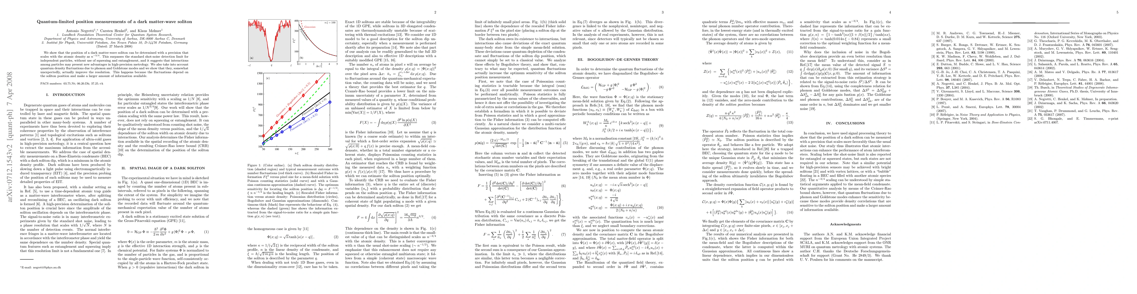 We show that the position of a dark matter-wave soliton can be determined with a precision that scales with the atomic density as $n^{-3/4}$. This surpasses the standard shot-noise detection limit for independent particles, without use of squeezing and entanglement, and it suggests that interactions among particles may present new advantages in high-precision metrology. We also take into account quantum density fluctuations due to phonon and Goldstone modes and we show that they, somewhat unexpectedly, actually improve the resolution. This happens because the fluctuations depend on the soliton position and make a larger amount of information available.