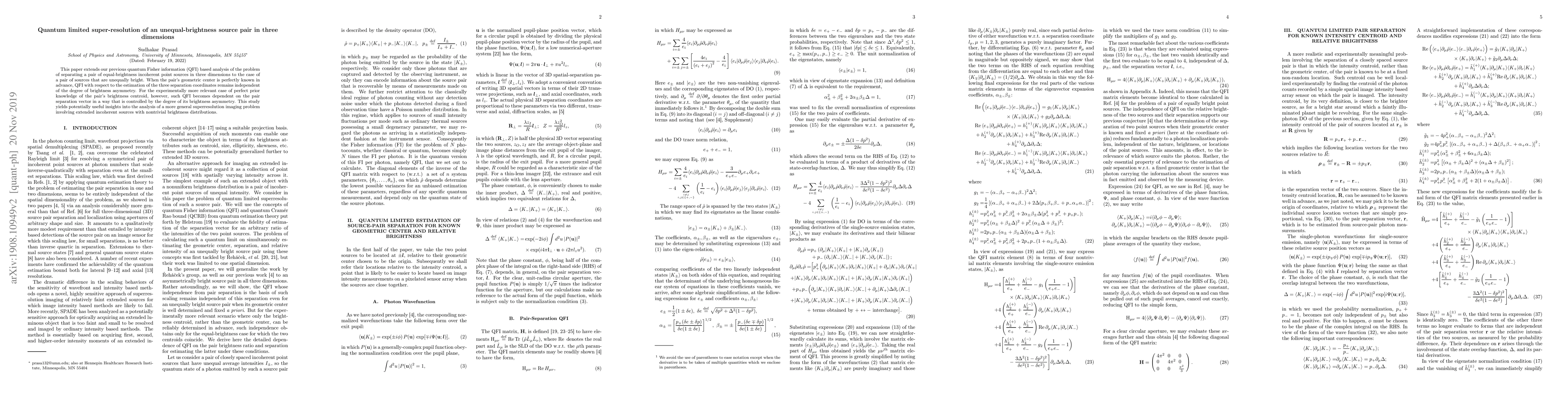 This paper extends our previous quantum Fisher information (QFI) based analysis of the problem of separating a pair of equal-brightness incoherent point sources in three dimensions to the case of a pair of sources that are unequally bright. When the pair's geometric center is perfectly known in advance, QFI with respect to the estimation of the three separation coordinates remains independent of the degree of brightness asymmetry. For the experimentally more relevant case of perfect prior knowledge of the pair's brightness centroid, however, such QFI becomes dependent on the pair separation vector in a way that is controlled by the degree of its brightness asymmetry. This study yields potentially useful insights into the analysis of a more general superresolution imaging problem involving extended incoherent sources with nontrivial brightness distributions.
