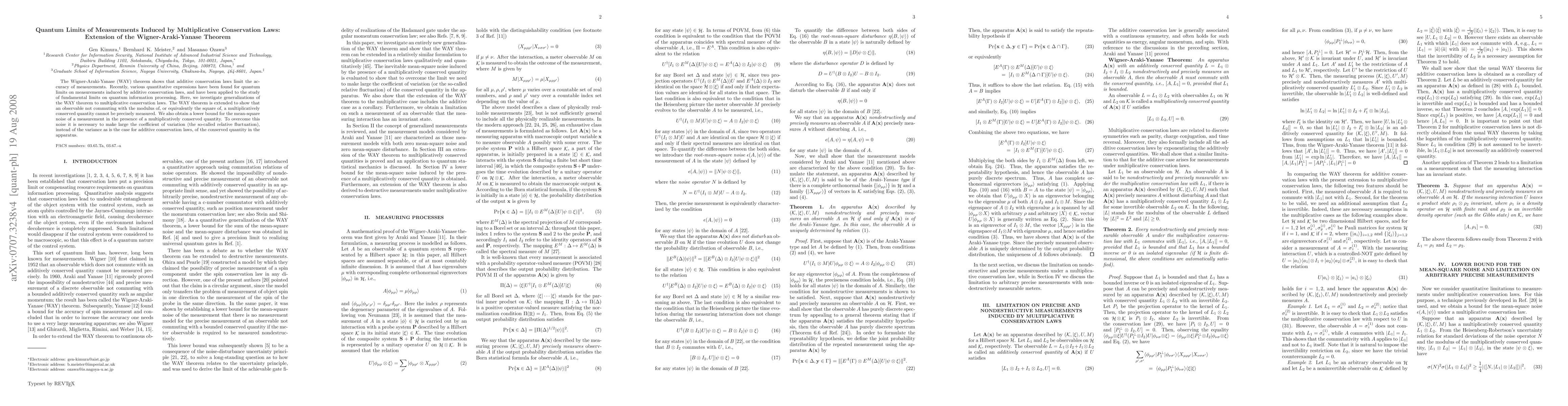 This paper extends the Wigner-Araki-Yanase theorem to multiplicative conservation laws, demonstrating that observables not commuting with the square of a multiplicatively conserved quantity cannot be precisely measured. It provides a lower bound for mean-square noise in such measurements, emphasizing the need to increase the coefficient of variation rather than variance to mitigate noise.