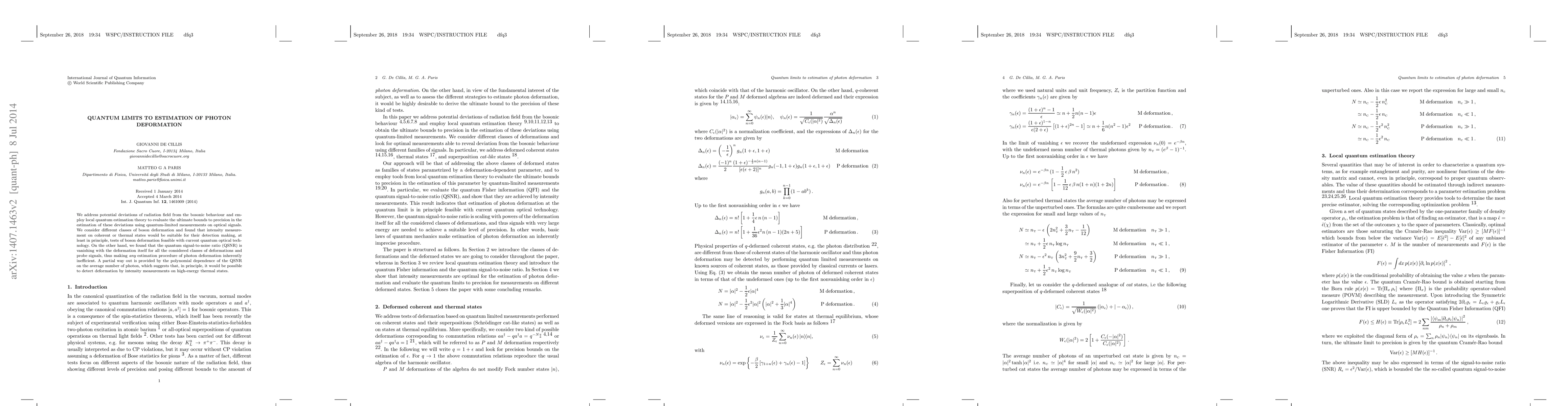 We address potential deviations of radiation field from the bosonic behaviour and employ local quantum estimation theory to evaluate the ultimate bounds to precision in the estimation of these deviations using quantum-limited measurements on optical signals. We consider different classes of boson deformation and found that intensity measurement on coherent or thermal states would be suitable for their detection making, at least in principle, tests of boson deformation feasible with current quantum optical technology. On the other hand, we found that the quantum signal-to-noise ratio (QSNR) is vanishing with the deformation itself for all the considered classes of deformations and probe signals, thus making any estimation procedure of photon deformation inherently inefficient. A partial way out is provided by the polynomial dependence of the QSNR on the average number of photon, which suggests that, in principle, it would be possible to detect deformation by intensity measurements on high-energy thermal states.