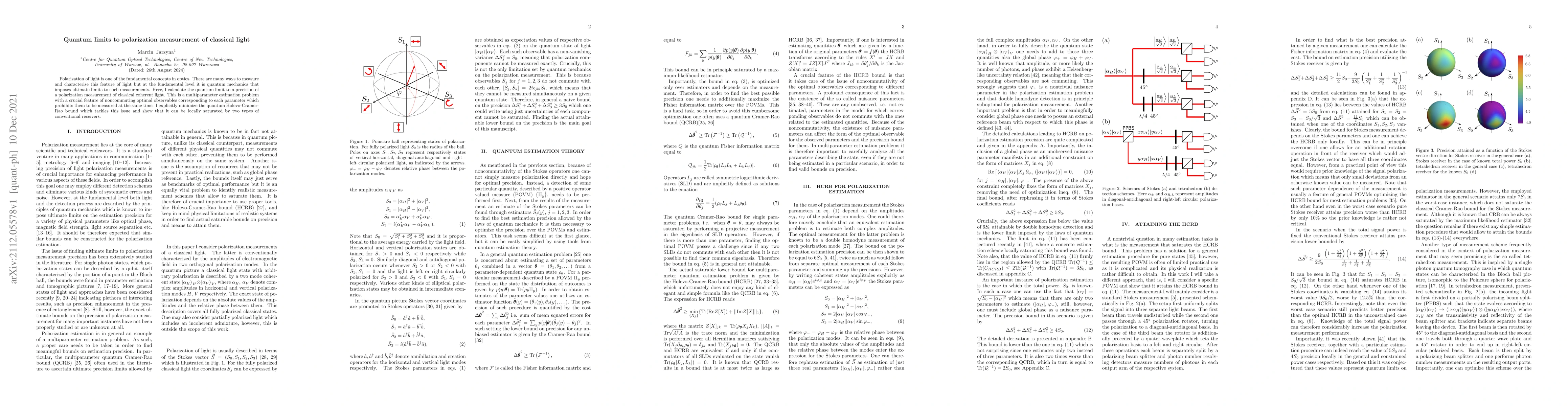 Polarization of light is one of the fundamental concepts in optics. There are many ways to measure and characterise this feature of light but at the fundamental level it is quantum mechanics that imposes ultimate limits to such measurements. Here, I calculate the quantum limit to a precision of a polarization measurement of classical coherent light. This is a multiparameter estimation problem with a crucial feature of noncommuting optimal observables corresponding to each parameter which prohibits them to be measured at the same time. I explicitly minimize the quantum Holevo-Cramer-Rao bound which tackles this issue and show that it can be locally saturated by two types of conventional receivers.
