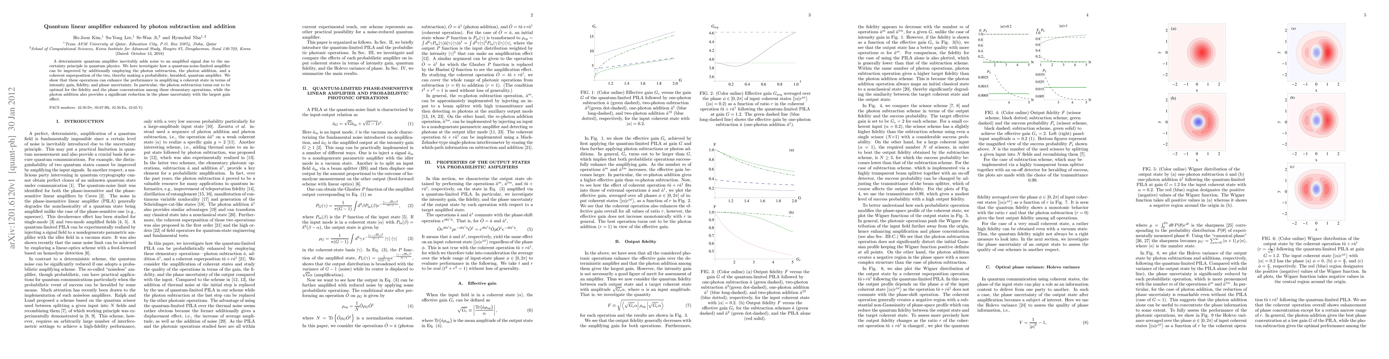 This paper explores a quantum-noise-limited amplifier's enhancement through photon subtraction, addition, and their coherent superposition, achieving a probabilistic, heralded quantum amplifier. The study demonstrates improved performance in amplifying coherent states, with photon subtraction being optimal for fidelity and phase concentration, and photon addition significantly reducing phase uncertainty while providing the largest gain.
