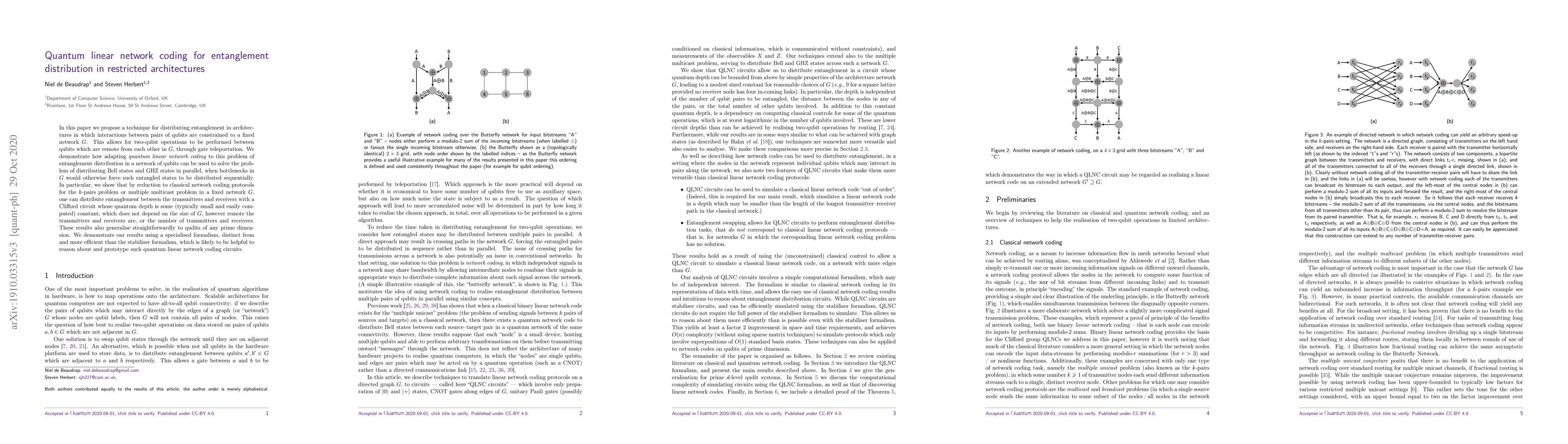 This paper proposes a quantum linear network coding technique for distributing entanglement in restricted qubit architectures, enabling parallel distribution of Bell and GHZ states despite network bottlenecks. The method reduces to classical network coding protocols, ensuring constant quantum depth regardless of network size.