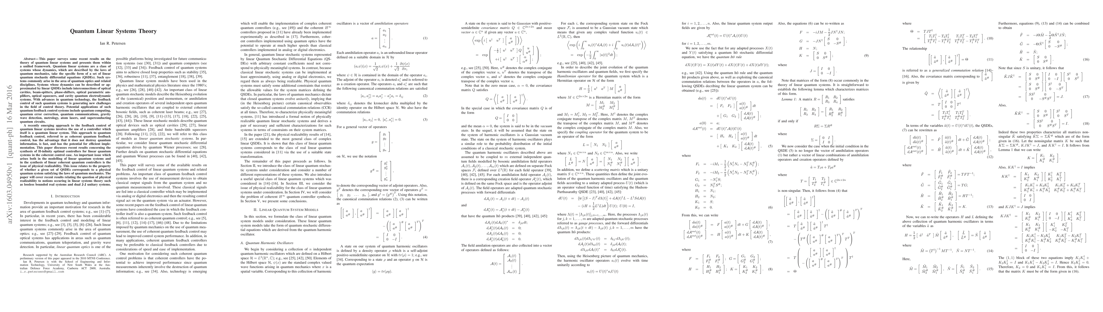 This paper surveys recent advancements in quantum linear systems theory, focusing on linear quantum stochastic differential equations and their applications in quantum optics. It discusses the synthesis of optimal coherent quantum feedback controllers, emphasizing the importance of physical realizability in both modeling and controller design.