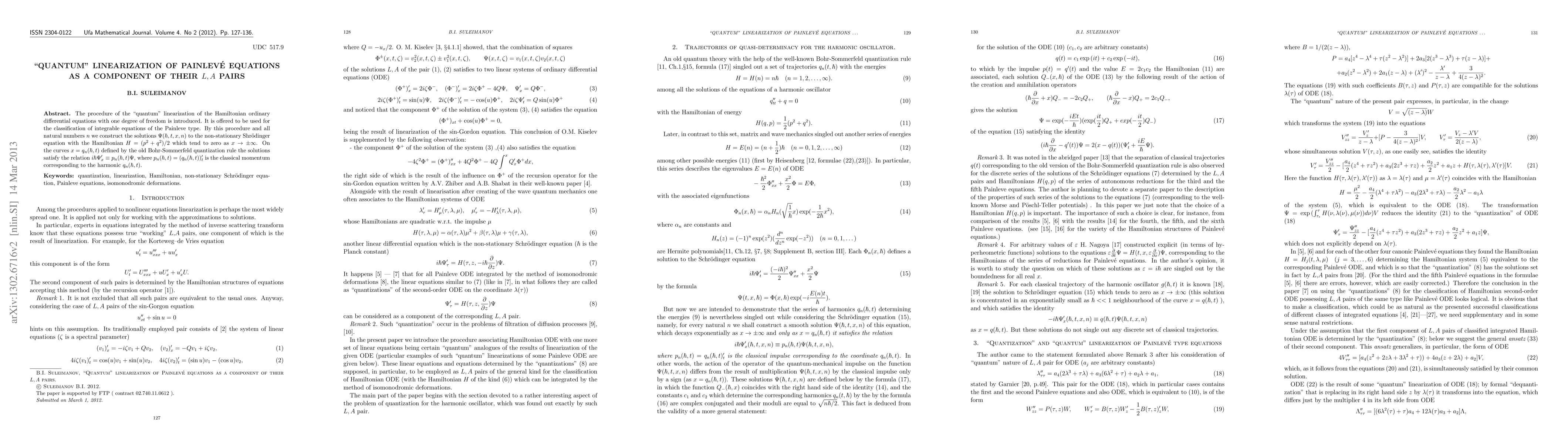 The procedure of the "quantum" linearization of the Hamiltonian ordinary differential equations with one degree of freedom is introduced. It is offered to be used for the classification of integrable equations of the Painleve type. By this procedure and all natural numbers $n$ we construct the solutions $\Psi(\hbar,t,x,n)$ to the non-stationary Shr\"{o}dinger equation with the Hamiltonian $H = (p^2+q^2)/2$ which tend to zero as $x\to\pm\infty$. On the curves $x=q_n (\hbar, t) $ defined by the old Bohr-Sommerfeld quantization rule the solutions satisfy the relation $i\hbar \Psi '_x\equiv p_n (\hbar, t) \Psi $, where $p_n (\hbar, t) = (q_n (\hbar, t)) '_t $ is the classical momentum corresponding to the harmonic $q_n (\hbar, t) $.