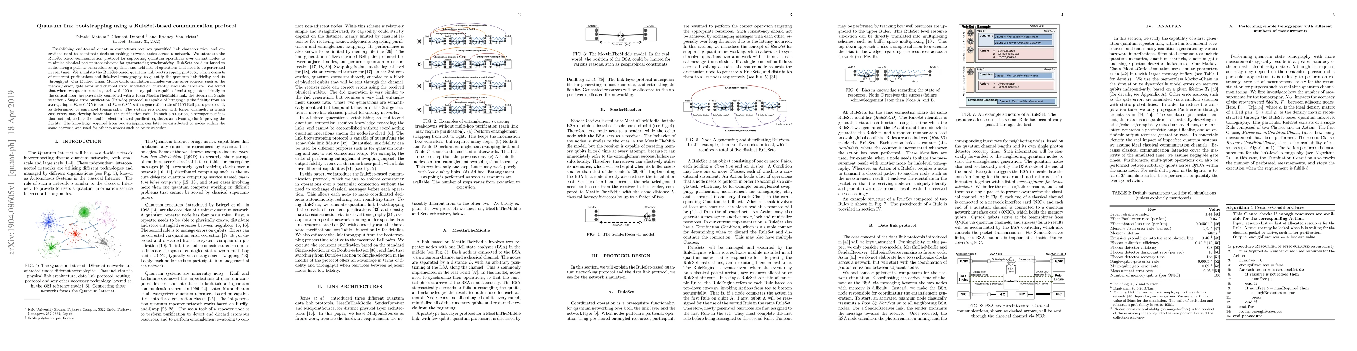 Establishing end-to-end quantum connections requires quantified link characteristics, and operations need to coordinate decision-making between nodes across a network. We introduce the RuleSet-based communication protocol for supporting quantum operations over distant nodes to minimize classical packet transmissions for guaranteeing synchronicity. RuleSets are distributed to nodes along a path at connection set up time, and hold lists of operations that need to be performed in real time. We simulate the RuleSet-based quantum link bootstrapping protocol, which consists of recurrent purifications and link-level tomography, to quantify the quantum link fidelity and its throughput. Our Markov-Chain Monte-Carlo simulation includes various error sources, such as the memory error, gate error and channel error, modeled on currently available hardware. We found that when two quantum nodes, each with 100 memory qubits capable of emitting photons ideally to the optical fiber, are physically connected with a 10km MeetInTheMiddle link, the Recurrent Single selection - Single error purification (RSs-Sp) protocol is capable of bringing up the fidelity from an average input $F_{r}=0.675$ to around $F_{r}=0.865$ with a generation rate of 1106 Bell pairs per second, as determined by simulated tomography. The system gets noisier with longer channels, in which case errors may develop faster than the purification gain. In such a situation, a stronger purification method, such as the double selection-based purification, shows an advantage for improving the fidelity. The knowledge acquired from bootstrapping can later be distributed to nodes within the same network, and used for other purposes such as route selection.