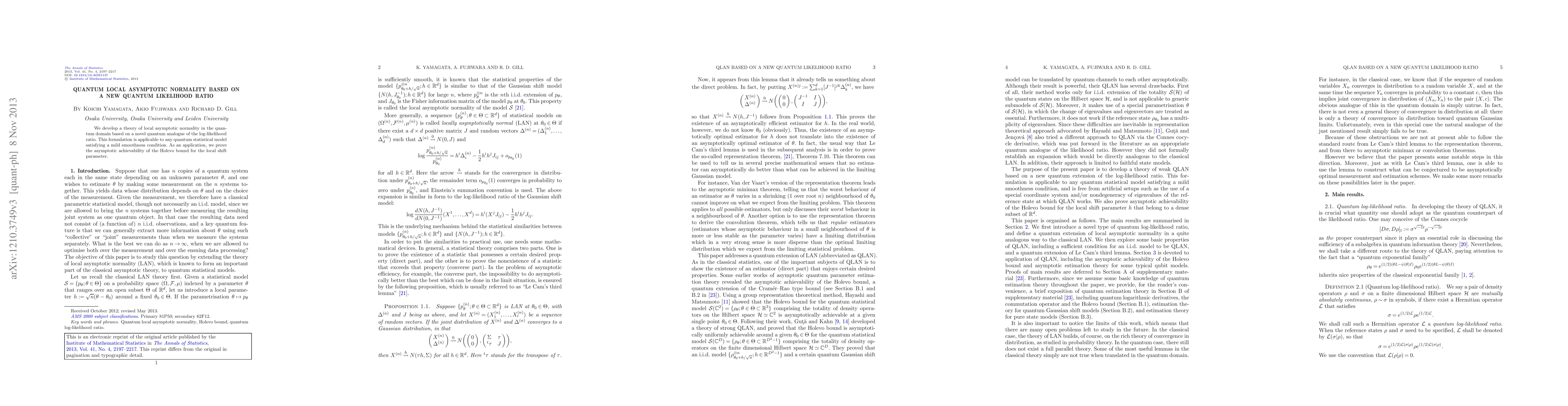 Summary: This paper establishes a theory of local asymptotic normality in quantum statistics using a new quantum likelihood ratio, applicable to any smooth quantum statistical model. It demonstrates the asymptotic achievability of the Holevo bound for the local shift parameter.