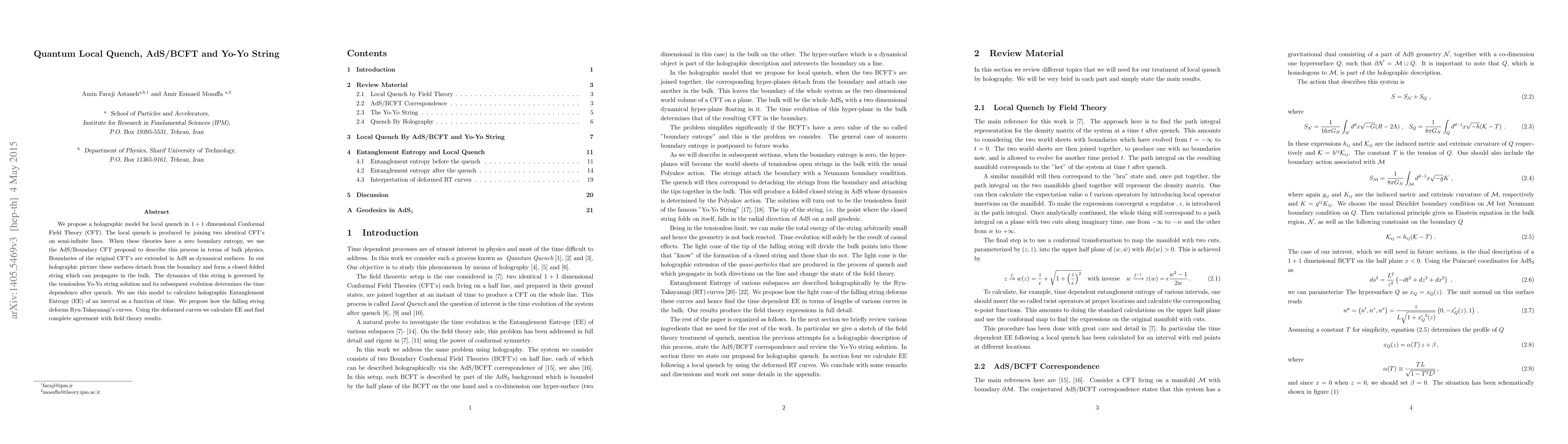 This paper proposes a holographic model for local quenches in 1+1 dimensional CFTs, using the AdS/BCFT framework to describe the dynamics of detached surfaces forming a Yo-Yo string. The model accurately calculates the time-dependent holographic Entanglement Entropy, showing agreement with field theory results.