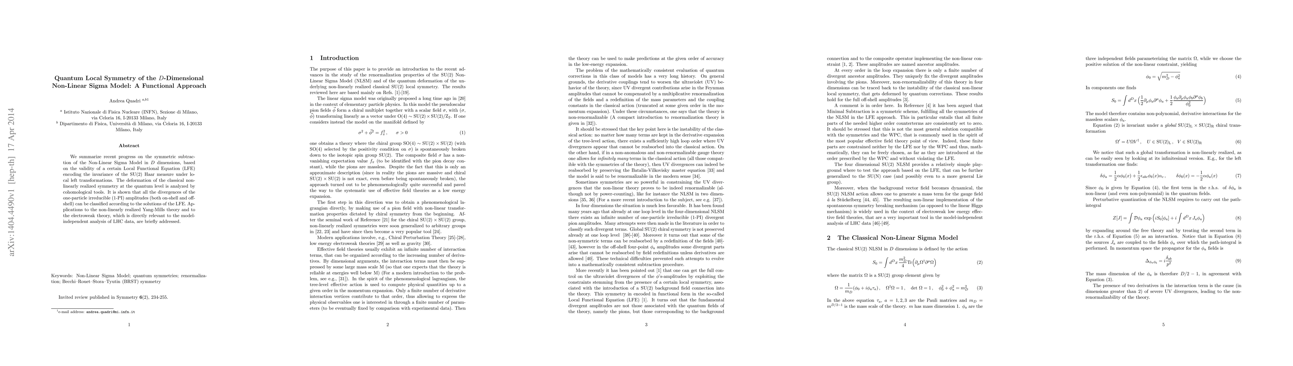 We summarize recent progress on the symmetric subtraction of the Non-Linear Sigma Model in $D$ dimensions, based on the validity of a certain Local Functional Equation (LFE) encoding the invariance of the SU(2) Haar measure under local left transformations. The deformation of the classical non-linearly realized symmetry at the quantum level is analyzed by cohomological tools. It is shown that all the divergences of the one-particle irreducible (1-PI) amplitudes (both on-shell and off-shell) can be classified according to the solutions of the LFE. Applications to the non-linearly realized Yang-Mills theory and to the electroweak theory, which is directly relevant to the model-independent analysis of LHC data, are briefly addressed.