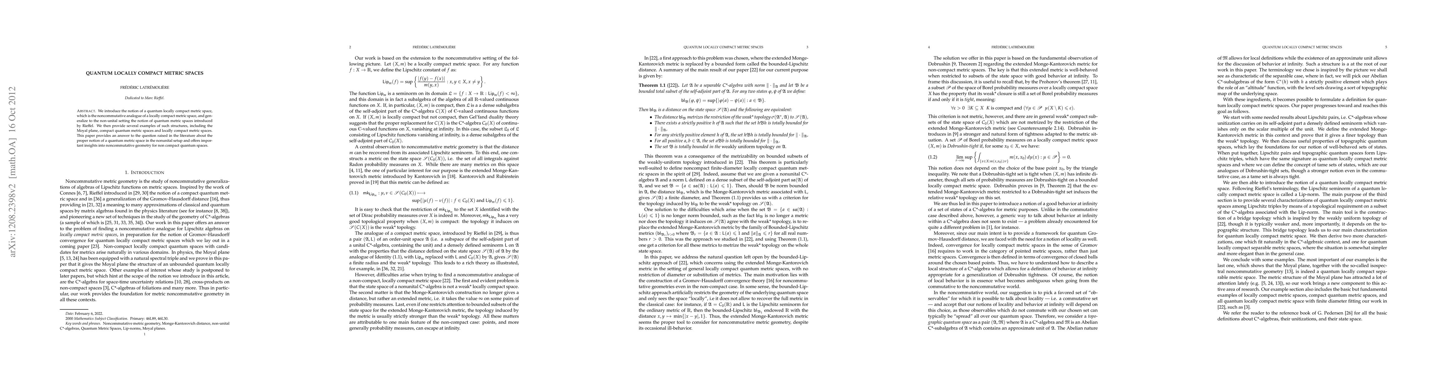 This paper defines quantum locally compact metric spaces as noncommutative analogues of locally compact metric spaces, extending Rieffel's quantum metric spaces to the nonunital setting. It provides examples like the Moyal plane and contributes to understanding noncommutative geometry in non-compact quantum spaces.