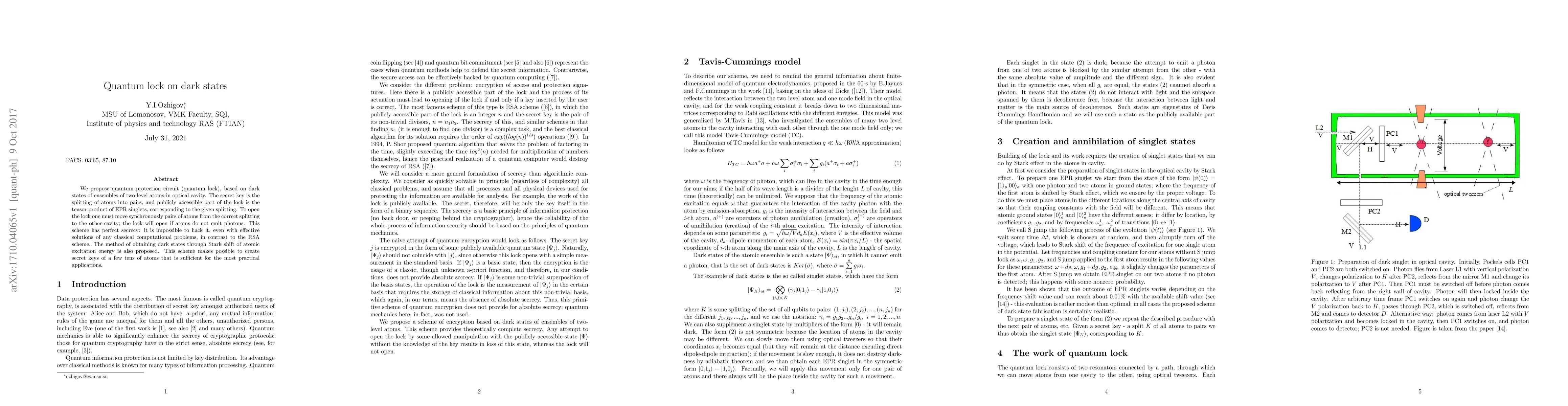 We propose quantum protection circuit (quantum lock), based on dark states of ensembles of two-level atoms in optical cavity. The secret key is the splitting of atoms into pairs, and publicly accessible part of the lock is the tensor product of EPR singlets, corresponding to the given splitting. To open the lock one must move synchronously pairs of atoms from the correct splitting to the other cavity; the lock will open if atoms do not emit photons. This scheme has perfect secrecy: it is impossible to hack it, even with effective solutions of any classical computational problems, in contrast to the RSA scheme. The method of obtaining dark states through Stark shift of atomic excitation energy is also proposed. This scheme makes possible to create secret keys of a few tens of atoms that is sufficient for the most practical applications.